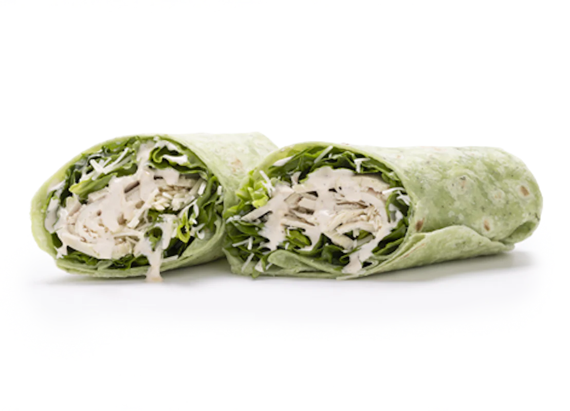 Chicken, Parmesan, romaine blend, and caesar dressing, wrapped in a spinach tortilla.