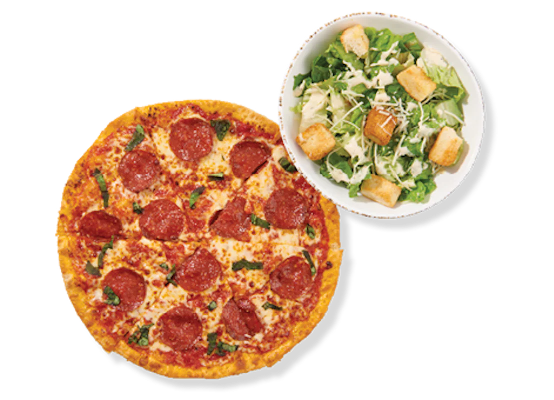 Choose any Entrée Pizza to pair with a Cup of Soup, Bowl of Fruit, Bowl of Pasta Salad, Bowl of Potato Salad, Half Mac & Cheese or a Half Salad. *Upcharge for Premium Pizzas and Salads. Calories are displayed with pizza by the slice. 6 slices per pizza.