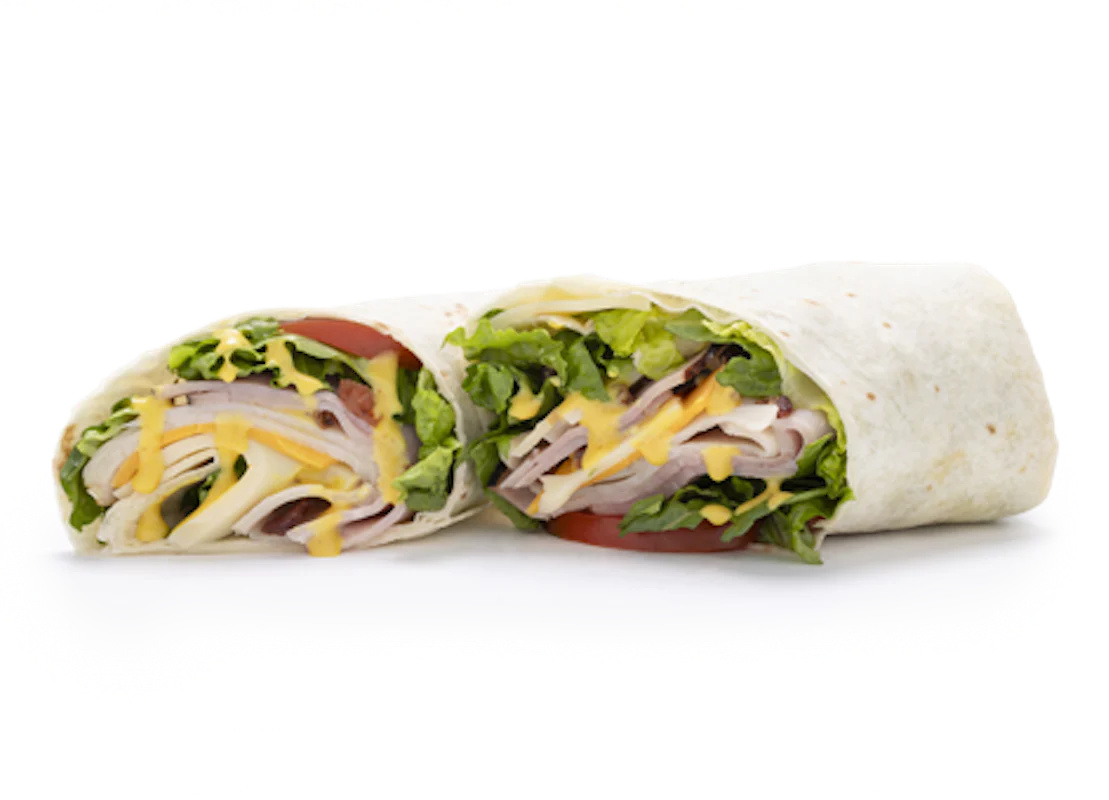 Ham, turkey, bacon, Swiss, cheddar, romaine blend, tomatoes and honey mustard, wrapped in a flour tortilla.