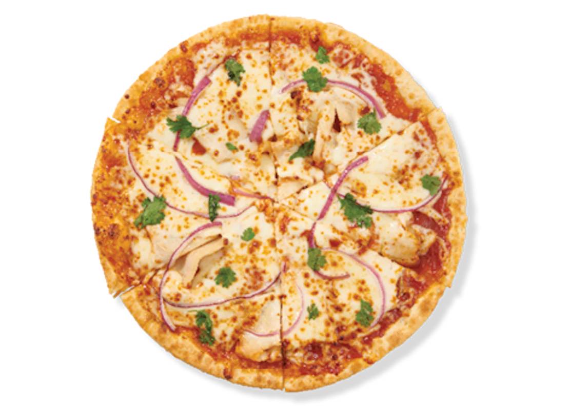 All-natural chicken, red onions, mozzarella, BBQ sauce, topped with fresh cilantro. Calories are displayed per slice. 6 slices per pizza.