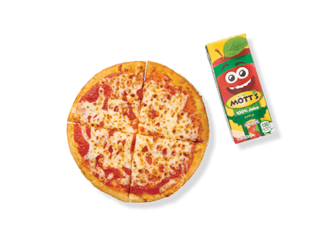 Mozzarella and pizza sauce on half of a regular pizza crust. For kids 12 and under. Includes kid’s fountain beverage (0-170 cal), or apple juice (100 cal).