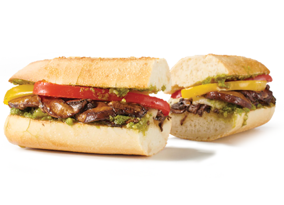 Baby Portabella mushrooms, red and yellow bell peppers, Swiss and basil pesto. (V)