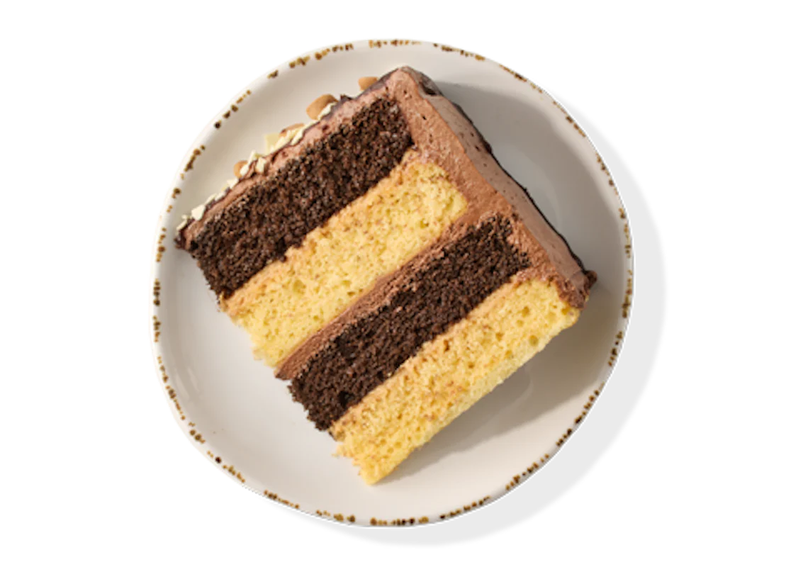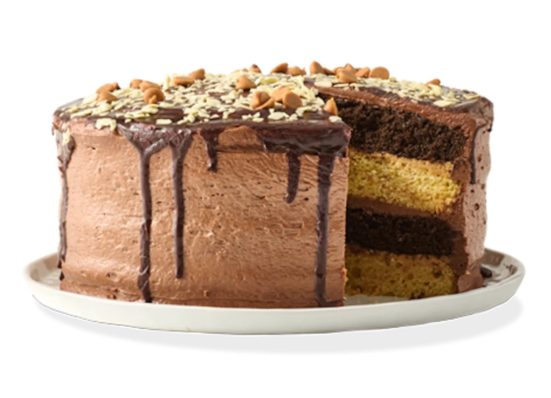 Chocolate cakes and Peanut Butter cakes, layered with a peanut butter mousse and chocolate icing, topped with chocolate ganache, peanut butter chips and white chocolate curls. Made in our very own bakery!