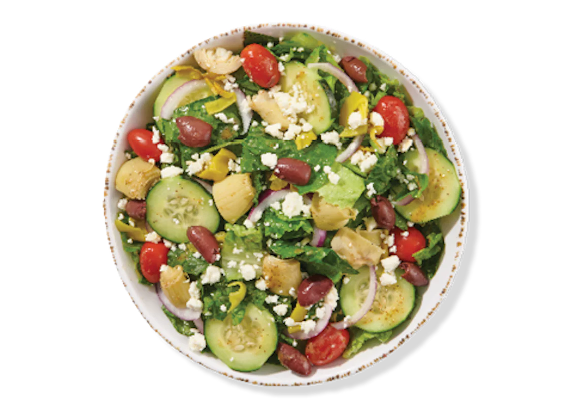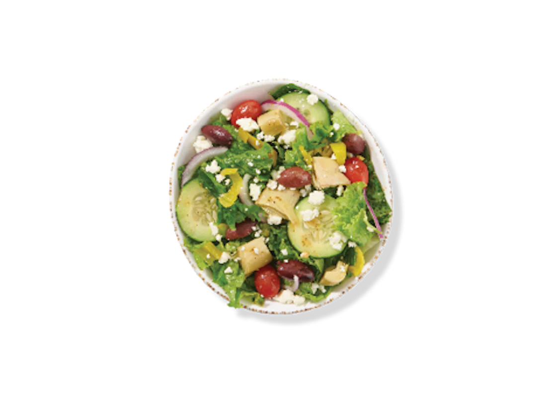 Romaine blend, artichoke hearts, Kalamata olives, cucumbers, pepperoncinis, red onions, tomatoes and feta served with Greek dressing. (V)