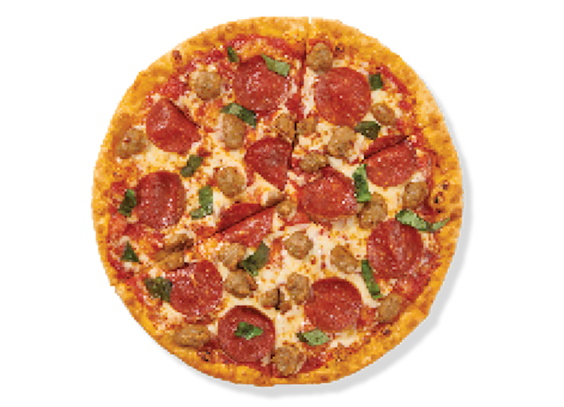 Pepperoni, Italian pork sausage, mozzarella and pizza sauce, topped with basil. Calories are displayed per slice. 6 slices per pizza.