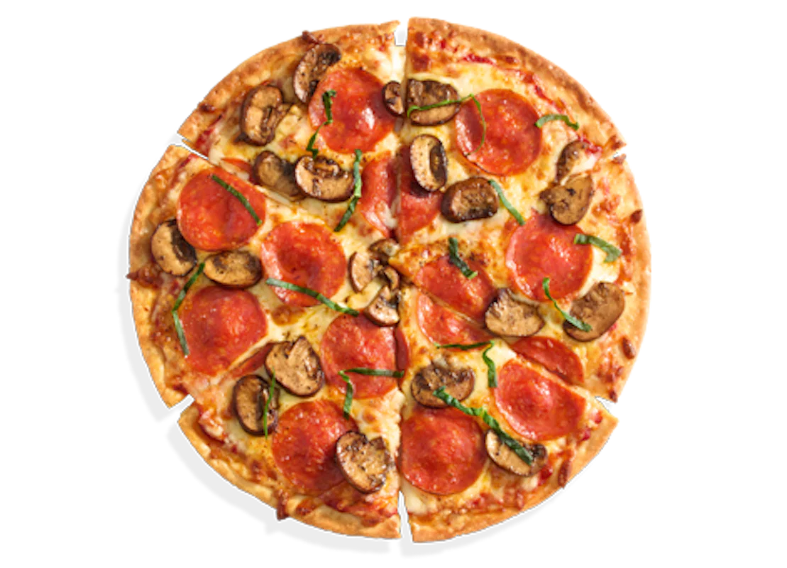 Pepperoni, baby portabella mushrooms, mozzarella, pizza sauce, topped with fresh basil.