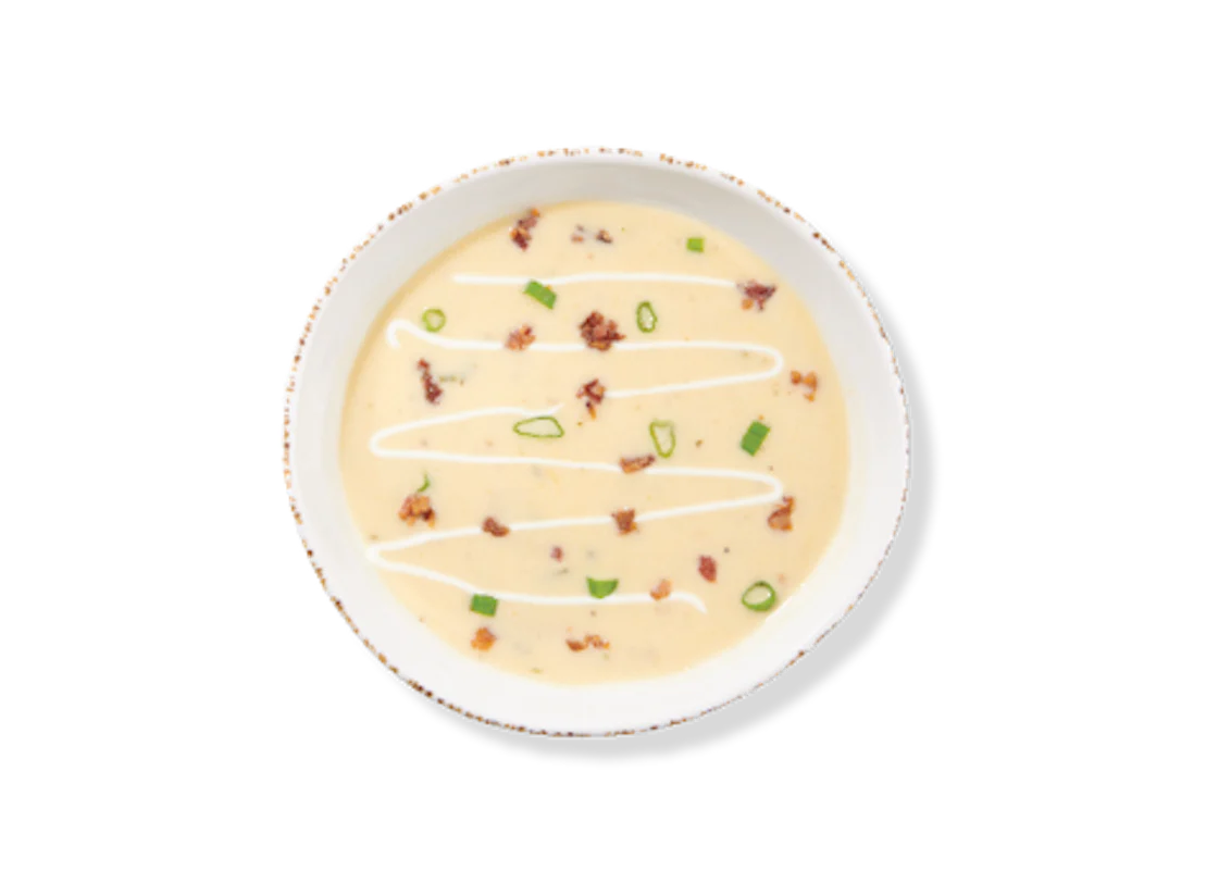 A creamy chowder of potatoes, chives, bacon, sour cream, and melted cheese.