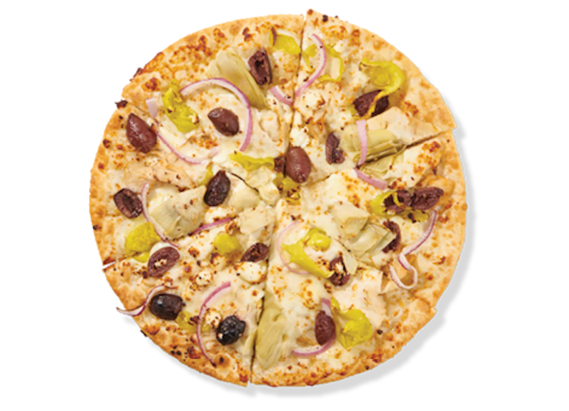 Chicken, mozzarella, feta, Kalamata olives, artichoke hearts, pepperoncinis, red onions. Calories are displayed per slice. 6 slices per pizza.