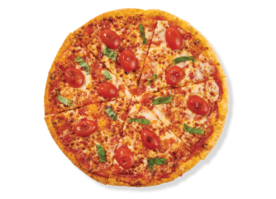 Grape tomatoes, mozzarella and pizza sauce, topped with basil. (V) Calories are displayed per slice. 6 slices per pizza.