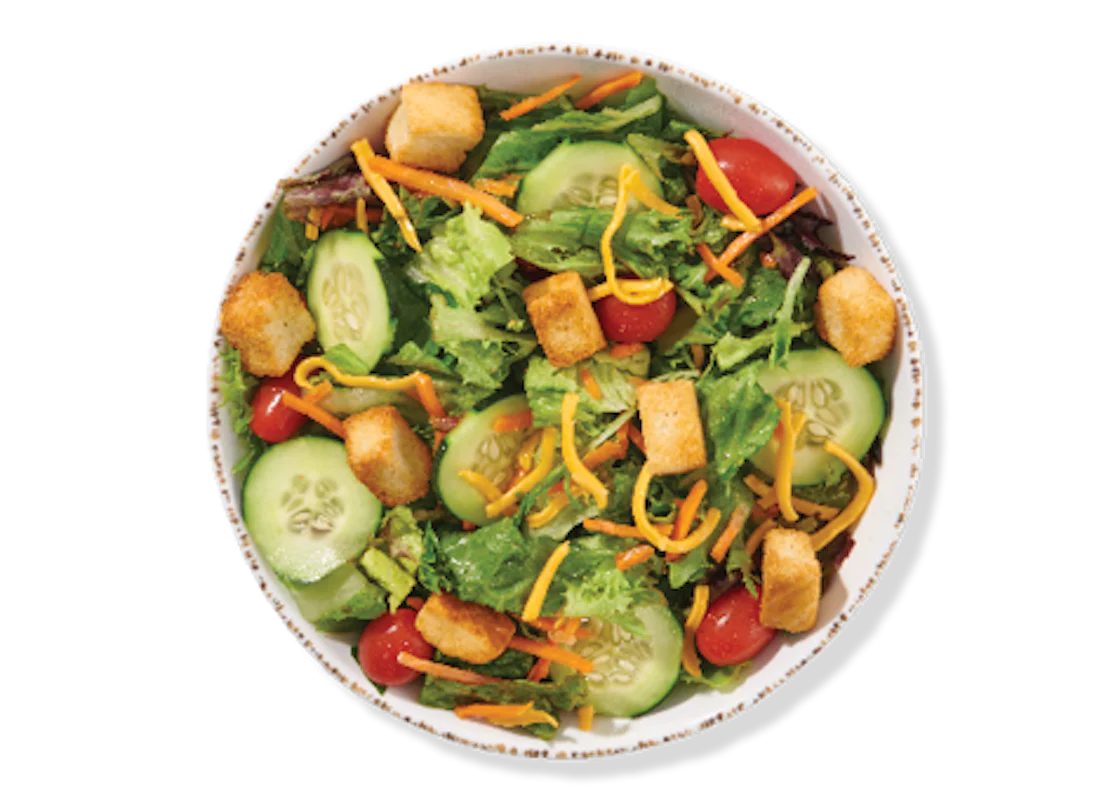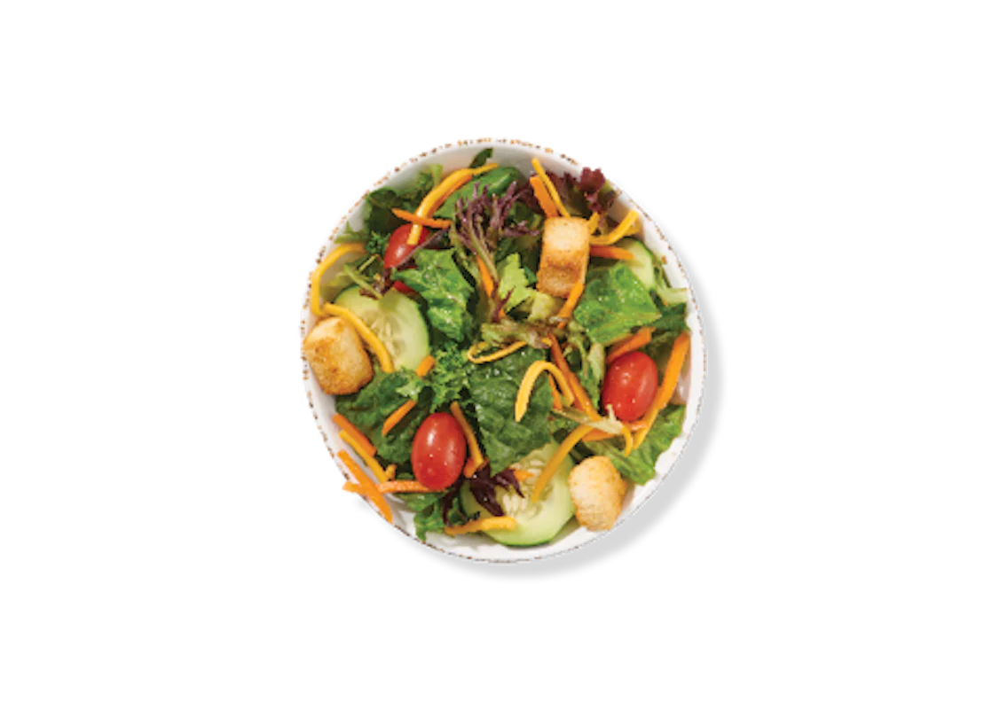 Mixed greens, tomatoes, cucumbers, shredded carrots, cheddar and croutons served with your choice of dressing. Adds 250-450 cal. (V)