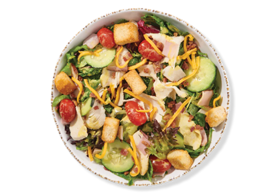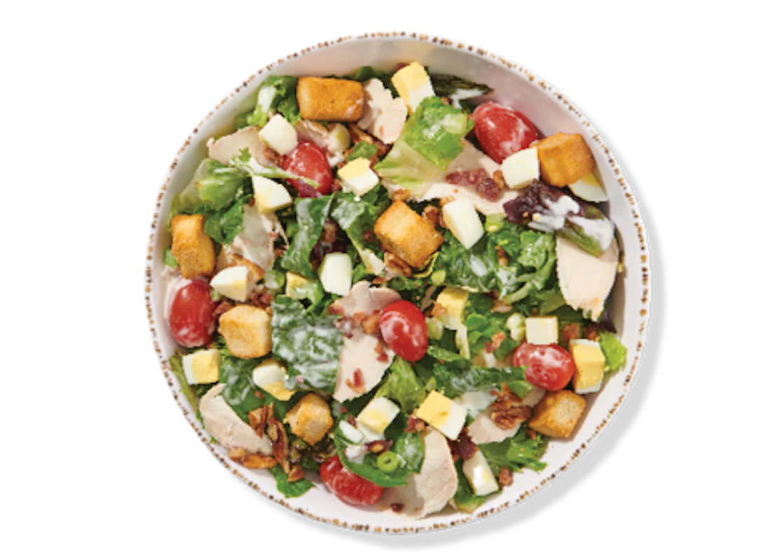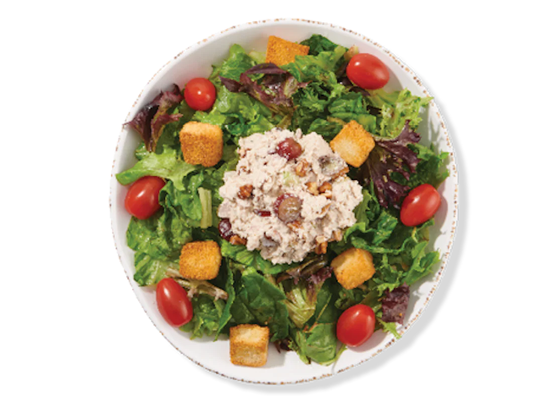 Newk’s Chicken Salad topped on a bed of mixed greens, tomatoes and croutons served with your choice of dressing. Adds 250-450 cal. (N)
