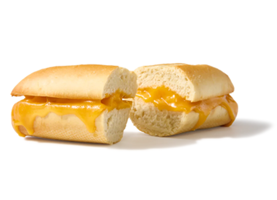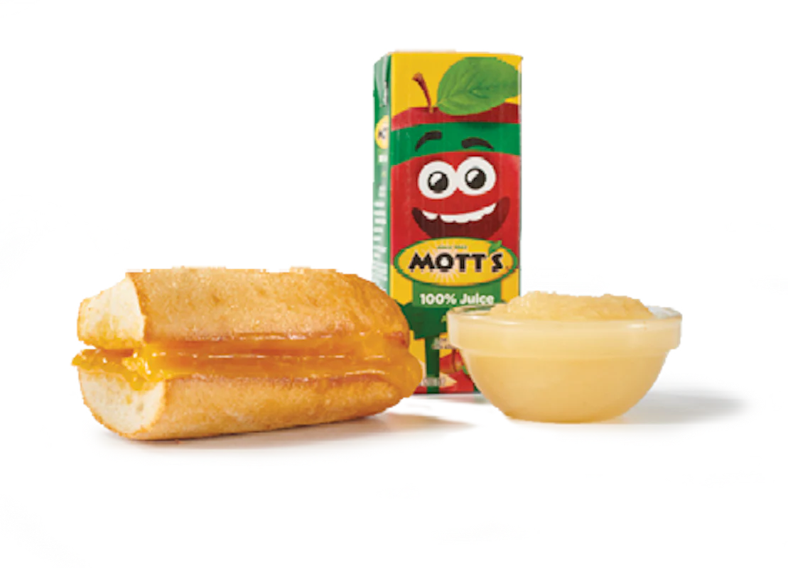 Aged cheddar cheese melted onto French Parisian bread with choice of fruit (45 cal), applesauce (40 cal) or bag of chips (140-300 cal). For kids 12 and under. Includes kid’s fountain beverage (0-170 cal), or apple juice (100 cal).