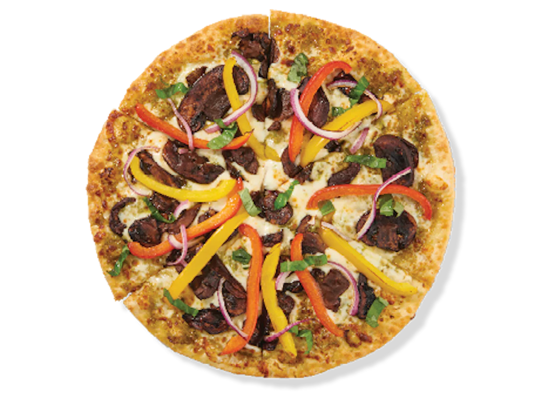 Baby Portabella mushrooms, red and yellow bell peppers, red onions, mozzarella and basil pesto, topped with basil. (V) Calories are displayed per slice. 6 slices per pizza.