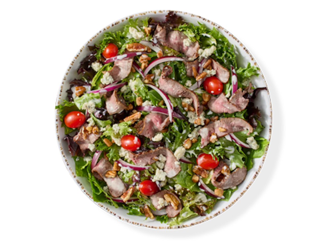 6oz Sliced sirloin steak, mixed greens, pecans, grape tomatoes, red onions, Bleu Cheese, with Bleu Cheese dressing