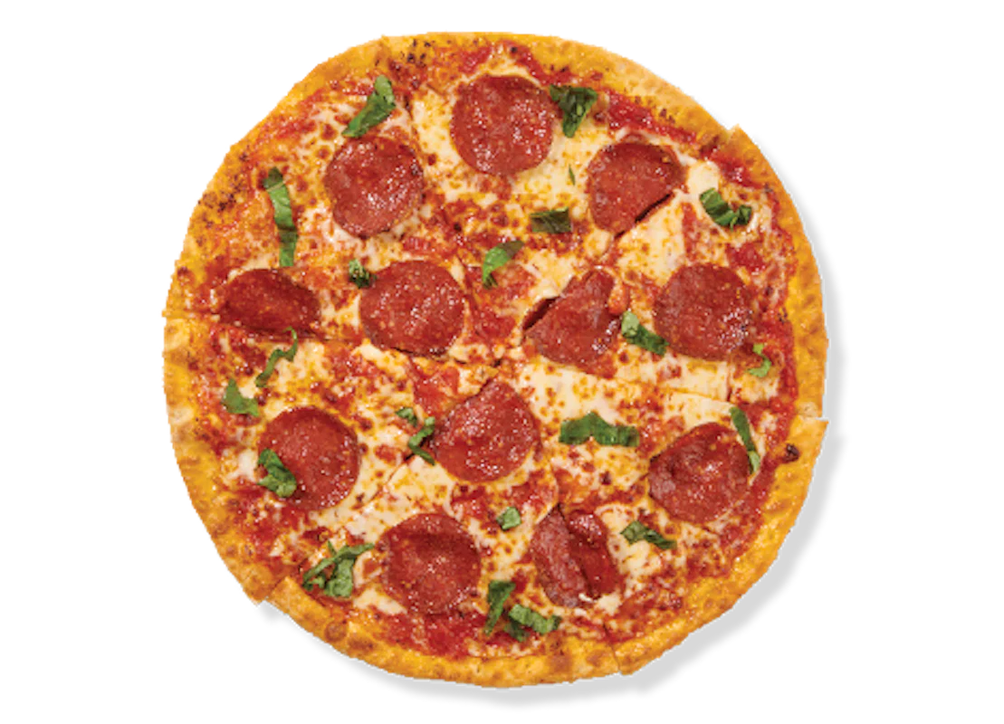 Pepperoni, mozzarella and pizza sauce, topped with basil. Calories are displayed per slice. 6 slices per pizza.