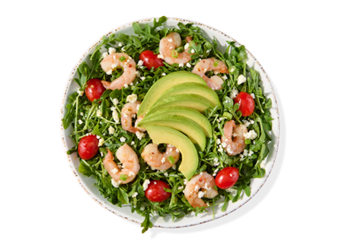 Seasoned shrimp, arugula, avocado, feta, tomatoes and green onions served with Lemon Basil Vinaigrette dressing.
