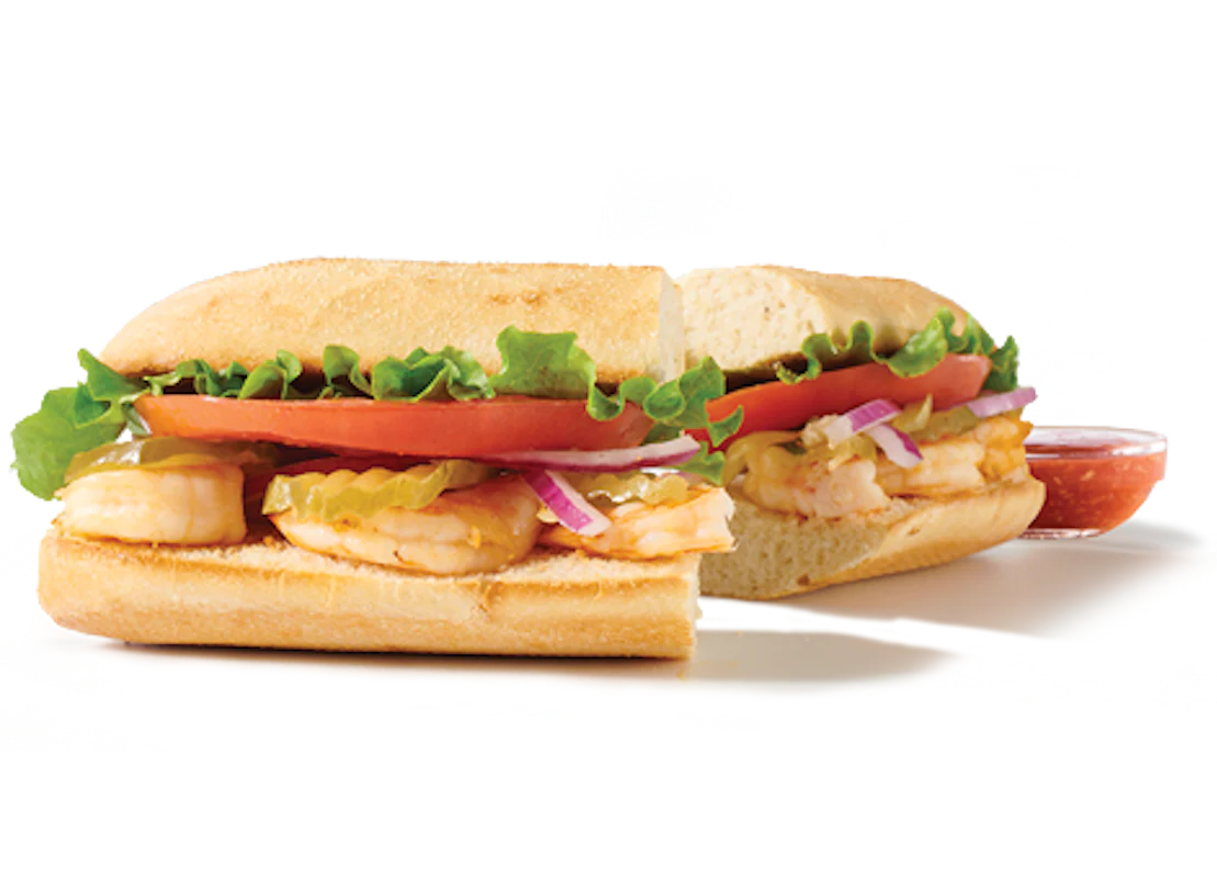 Seasoned shrimp, olive oil, lettuce, tomatoes, pickles and red onions, with a side of cocktail sauce.