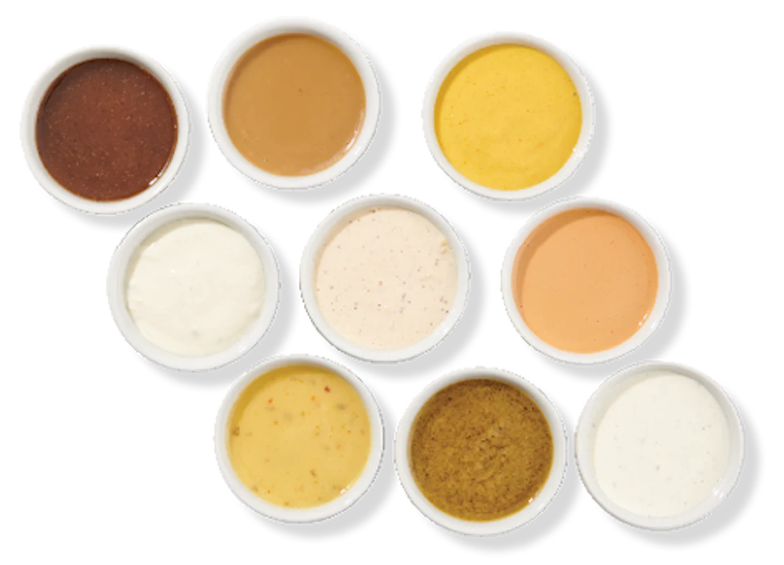 Honey Mustard, Balsamic Vinaigrette, Sherry Vinaigrette, Bleu Cheese, Ranch, Caesar.