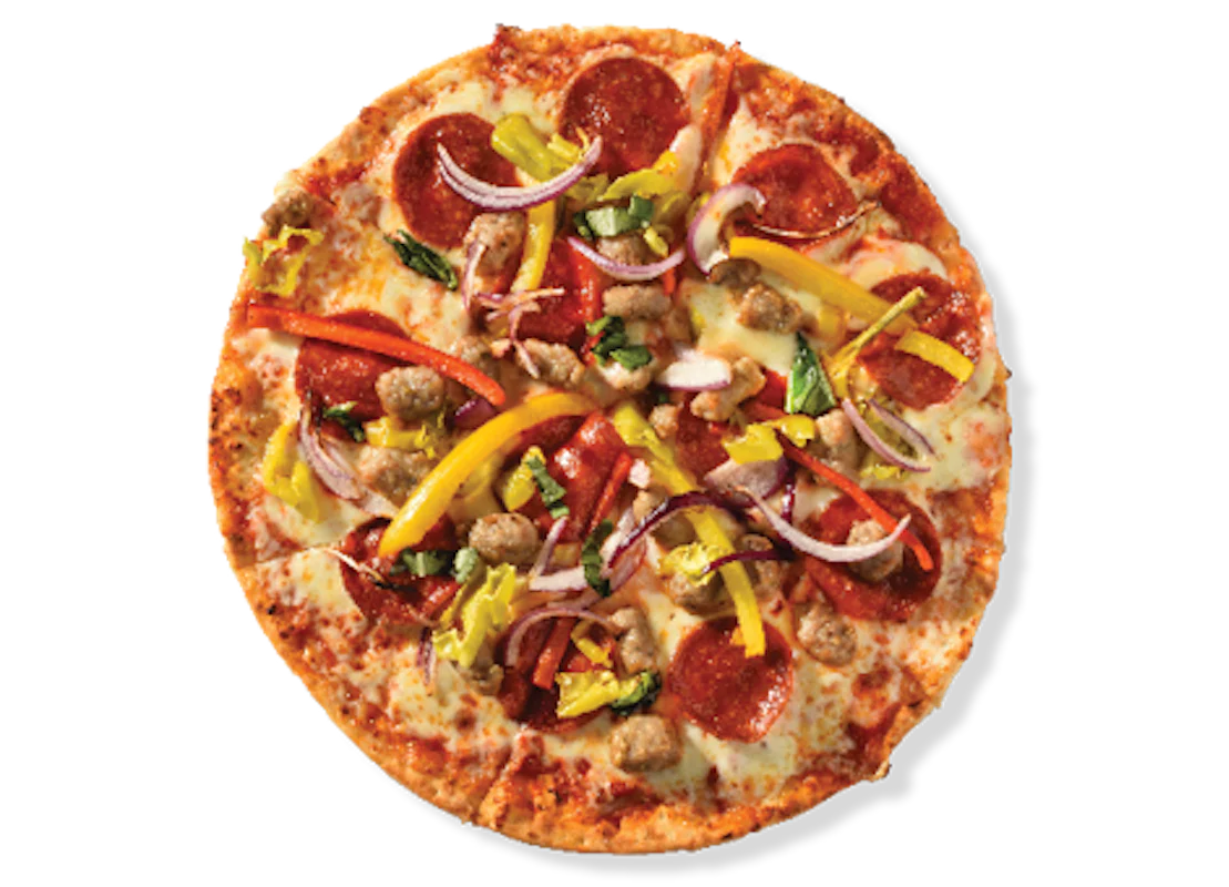Pepperoni, Italian pork sausage, mozzarella, red and yellow bell peppers, red onions, pepperoncinis, and pizza sauce, with basil. Calories are displayed per slice. 6 slices per pizza.