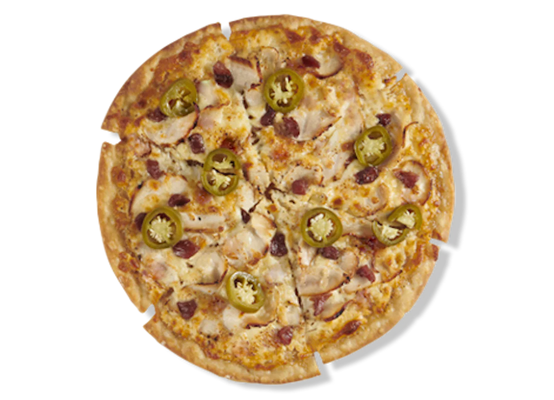 Chicken, bacon, mozzarella, our signature white BBQ sauce and chili oil, topped with jalapeños. (N) Calories are displayed per slice. 6 slices per pizza.
