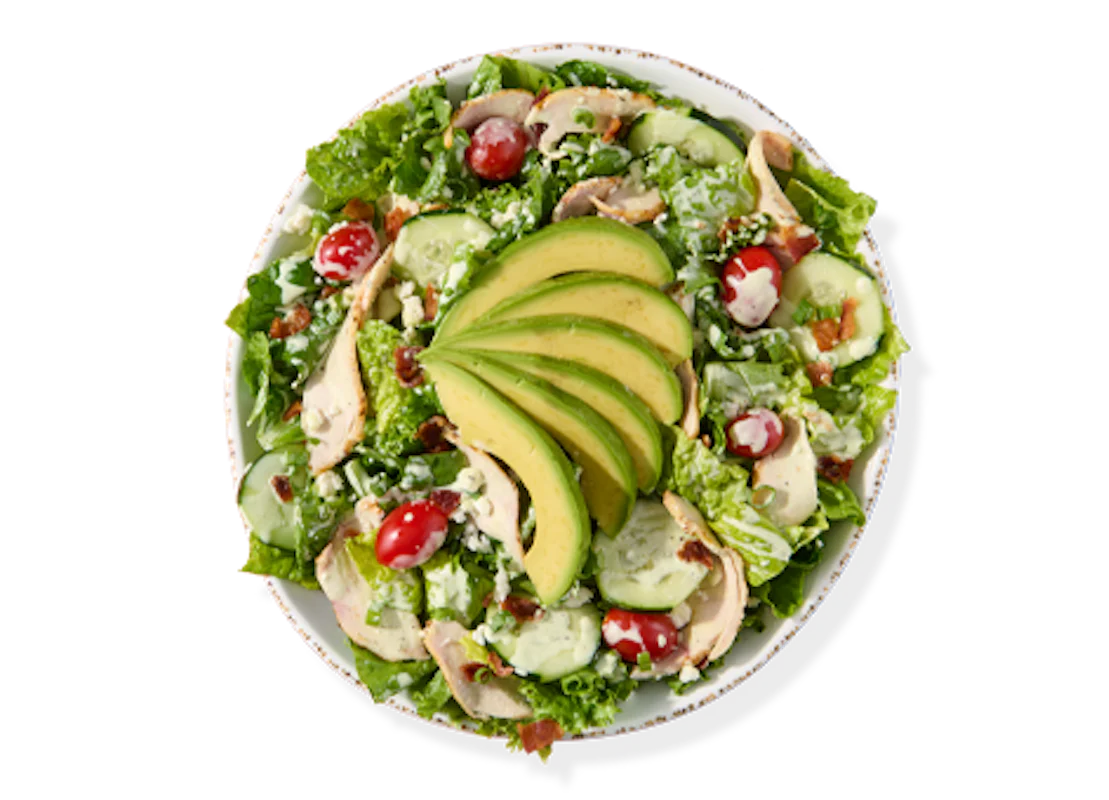 Chicken, romaine blend, bacon, tomatoes, cucumbers, feta, avocado and green onions served with green goddess dressing.