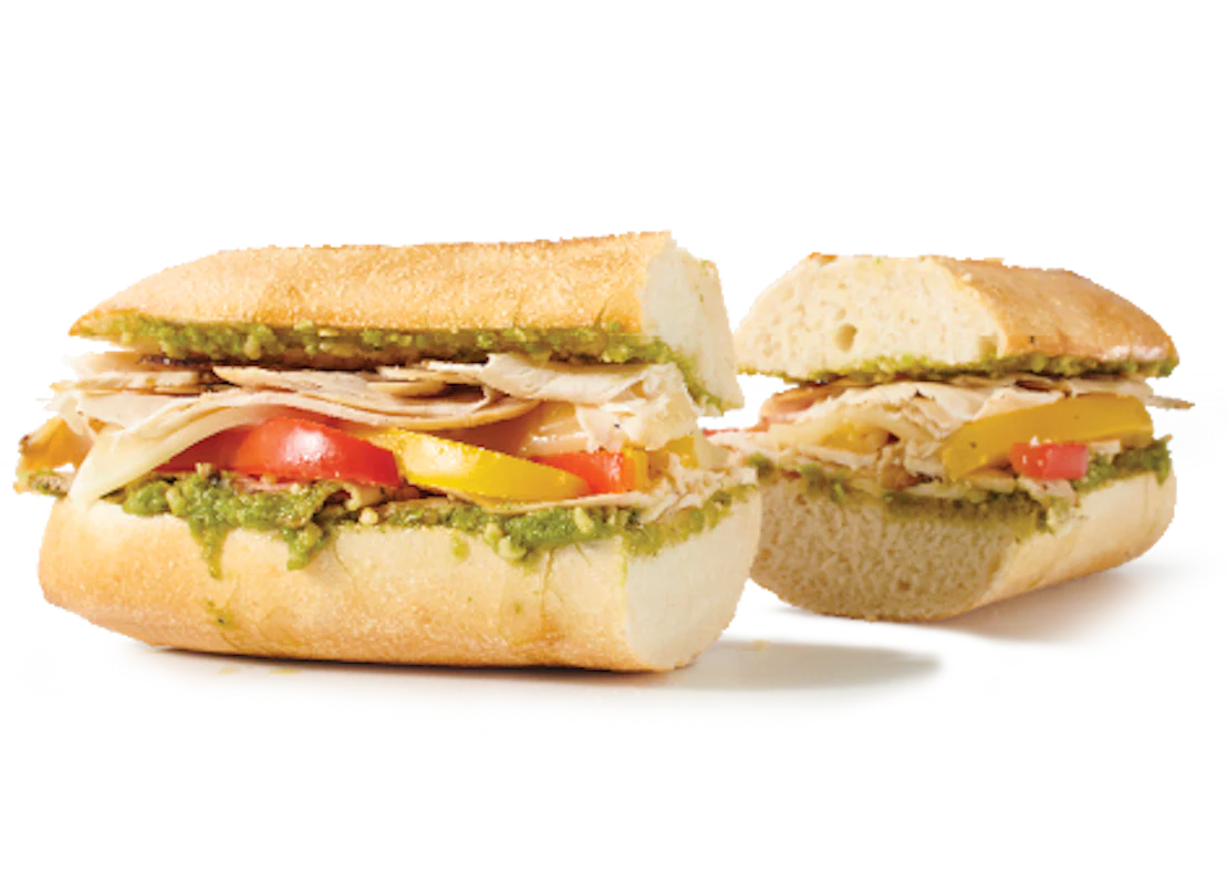 Chicken, red and yellow bell peppers, Swiss and basil pesto.