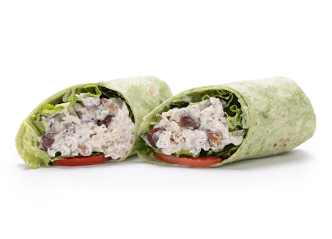Scratch-made Chicken Salad, romaine blend and tomatoes, wrapped in a spinach tortilla.