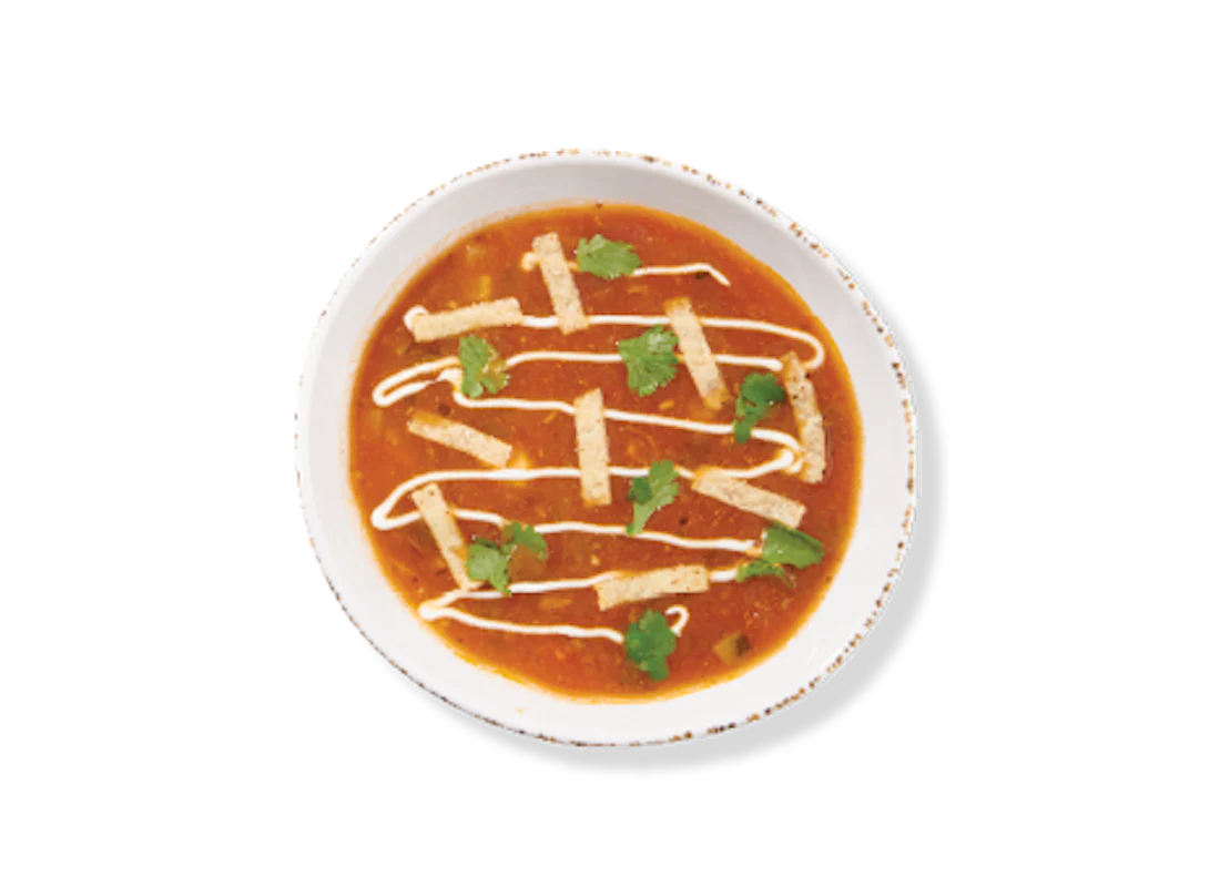 A rich chicken broth loaded with chicken and vegetables and seasoned with a touch of Ancho chilies, corn masa and cilantro.