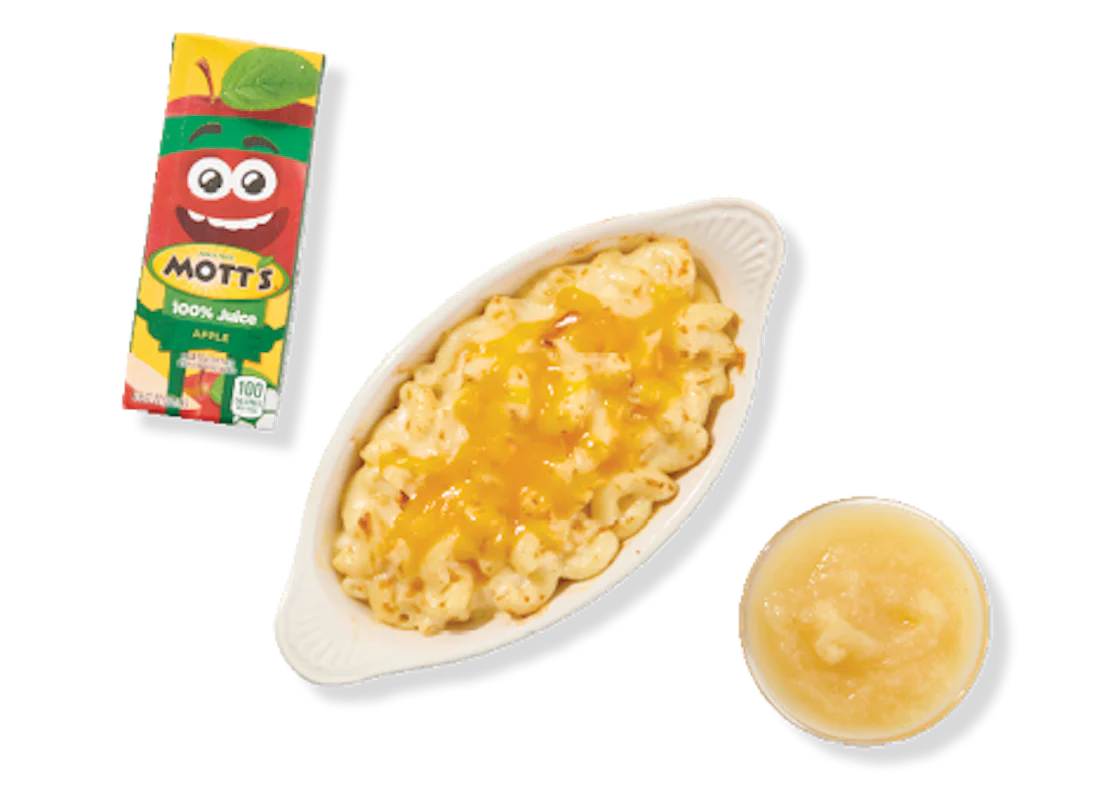 Blend of cheeses folded into elbow pasta topped with cheddar and baked. Served with choice of fruit (45 cal), applesauce (40 cal) or bag of chips (140-300 cal). For kids 12 and under. For kids 12 and under. Includes kid’s fountain beverage (0-170 cal), or apple juice (100 cal).