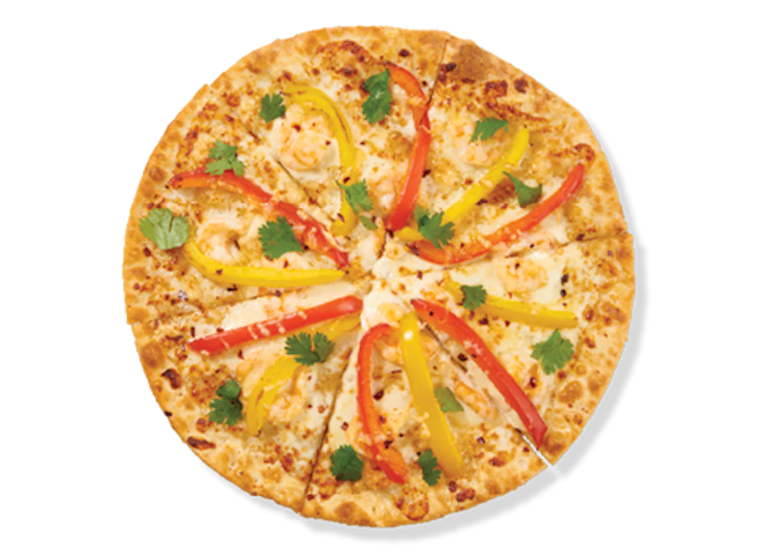 Seasoned shrimp, red and yellow bell peppers, mozzarella, Parmesan, red pepper flakes and chili oil, topped with cilantro. Calories are displayed per slice. 6 slices per pizza.