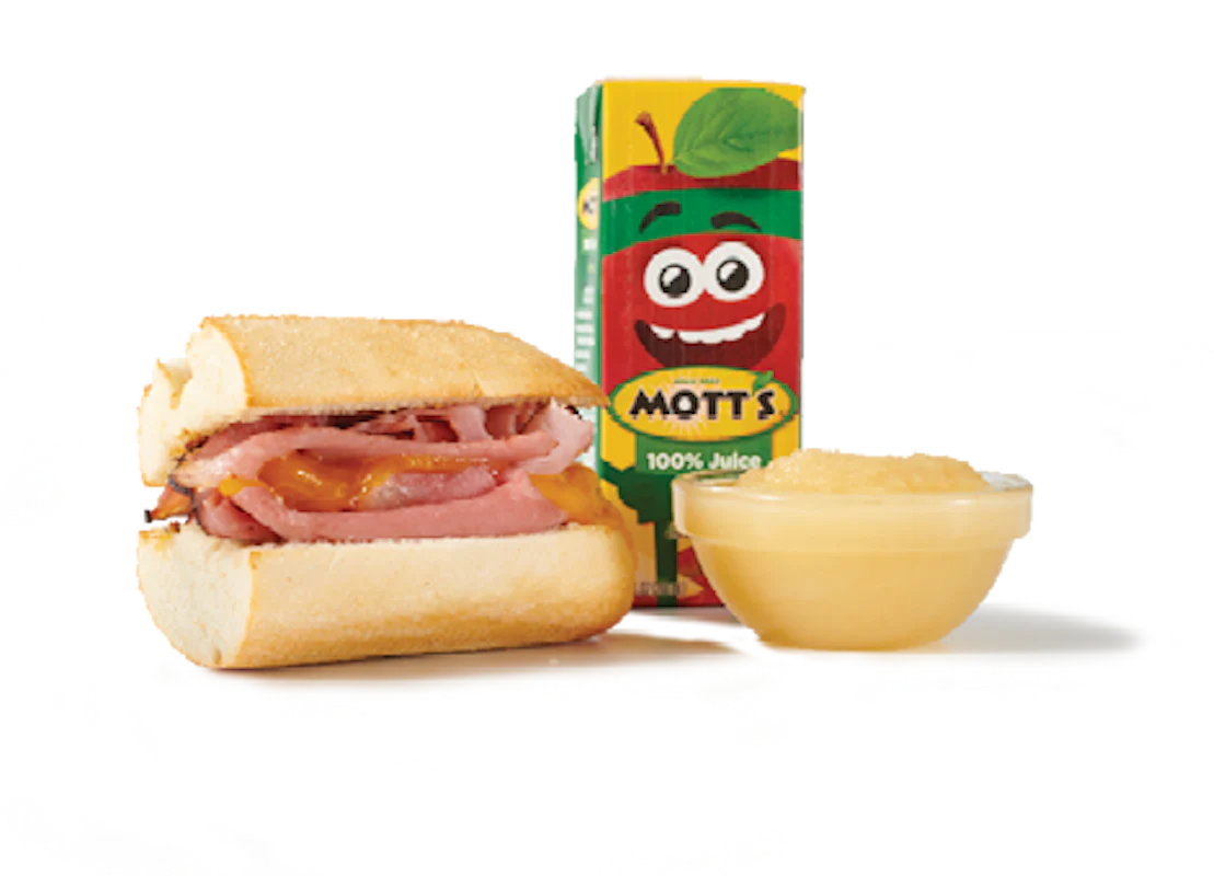 Ham and aged cheddar cheese served warm on French Parisian bread with choice of fruit (45 cal), applesauce (40 cal) or bag of chips (140-300 cal). For kids 12 and under. Includes kid’s fountain beverage (0-170 cal), or apple juice (100 cal).