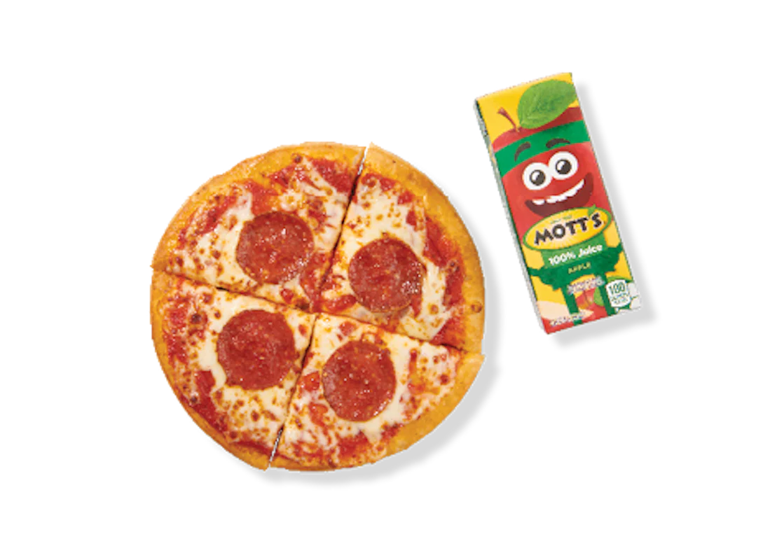 Pepperoni, mozzarella and pizza sauce on half of a regular pizza crust. For kids 12 and under. Includes kid’s fountain beverage (0-170 cal), or apple juice (100 cal).