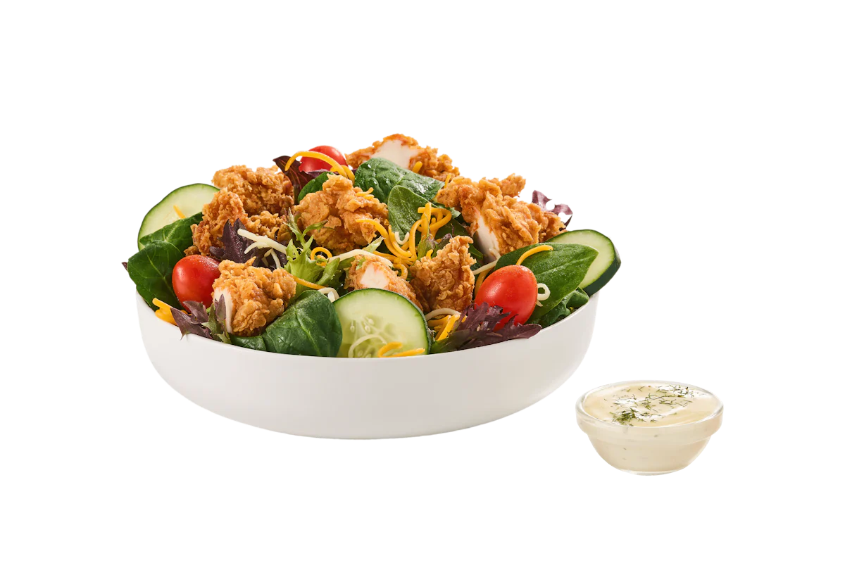 3 Chicken breast tenderloins marinated with a bold blend of seasonings served on a bed of fresh green leaf lettuce, red leaf lettuce, and baby spinach topped with cucumber slices, grape tomatoes, bacon, and Monterey Cheddar Cheese.