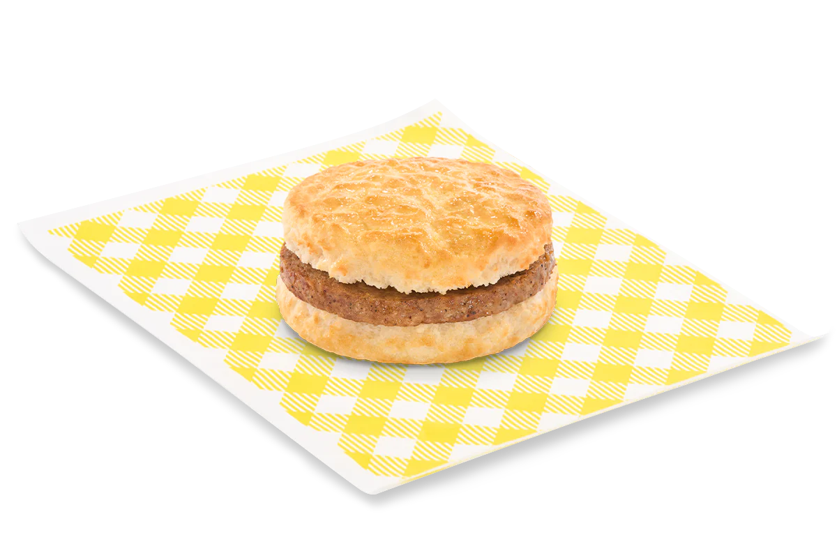 Country style sausage on a made-from-scratch buttermilk biscuit, served with Bo-Tato Rounds®, coffee or medium drink.