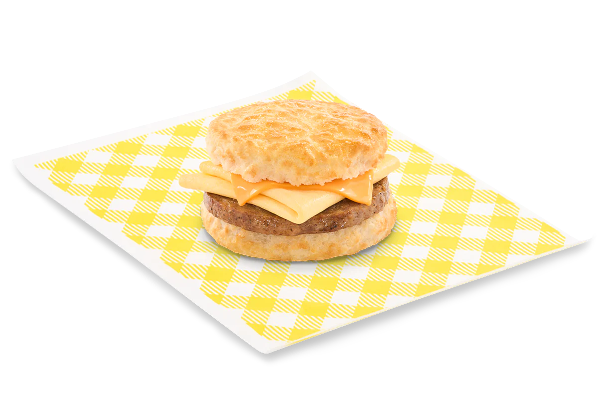 Eggs, country style sausage and American cheese on a made-from-scratch buttermilk biscuit.