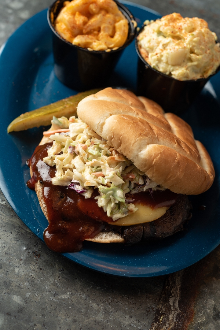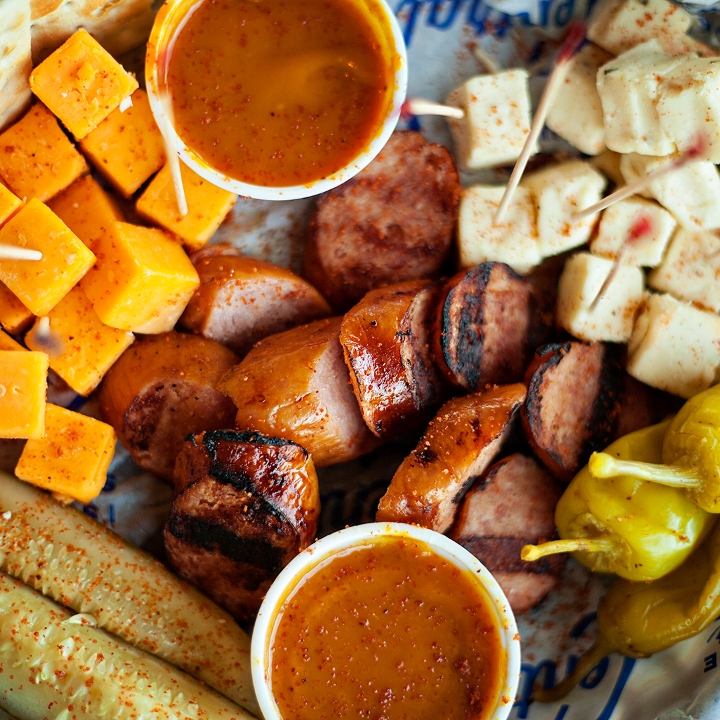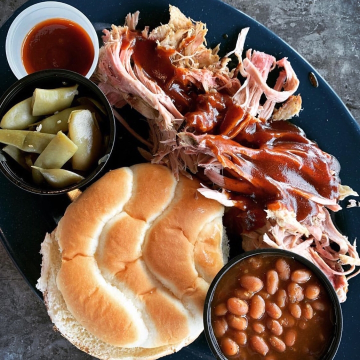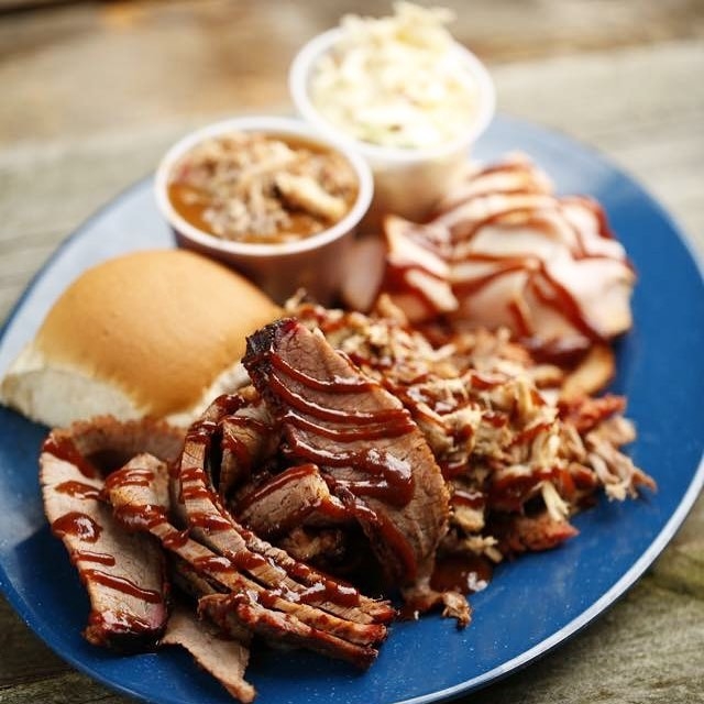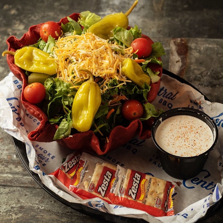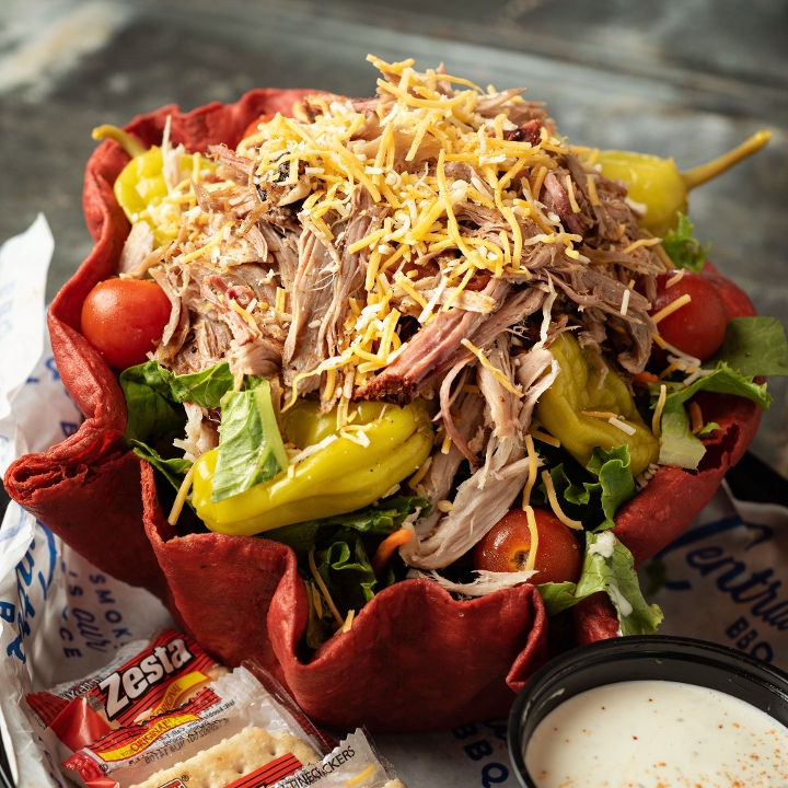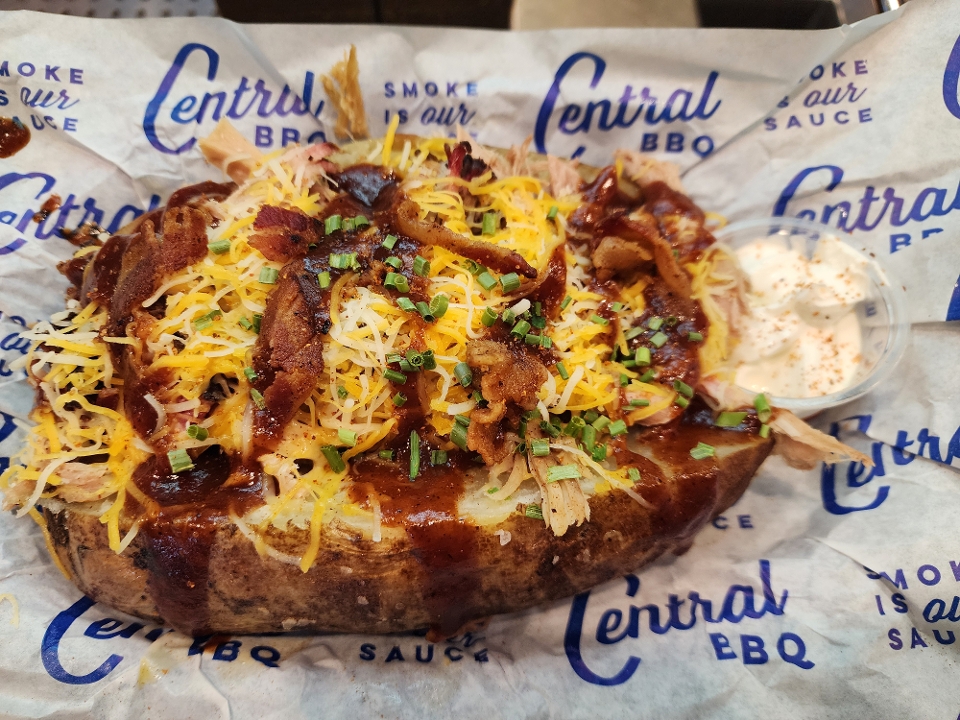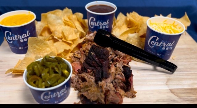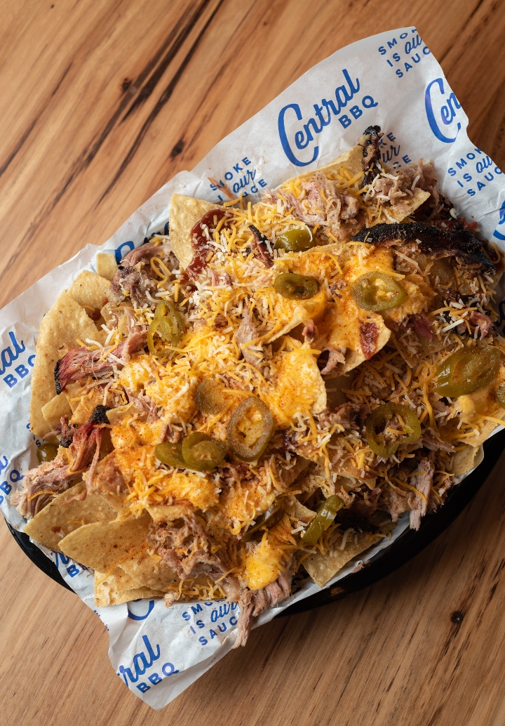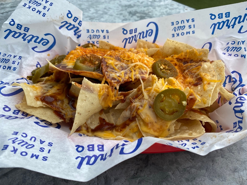 Homeade fresh tortilla chips , our award winning BBQ sauce, Nacho cheese sauce, shredded cheese, jalapeños.Add Smoked Brisket, pork or chicken to level up !!