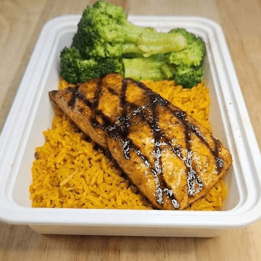 Quick-cured salmon, chargrilled and finished with our Cajun brown-sugar molasses glaze, smoky edges, sweet heat, buttery finish. Served over Dat Rice with broccoli.