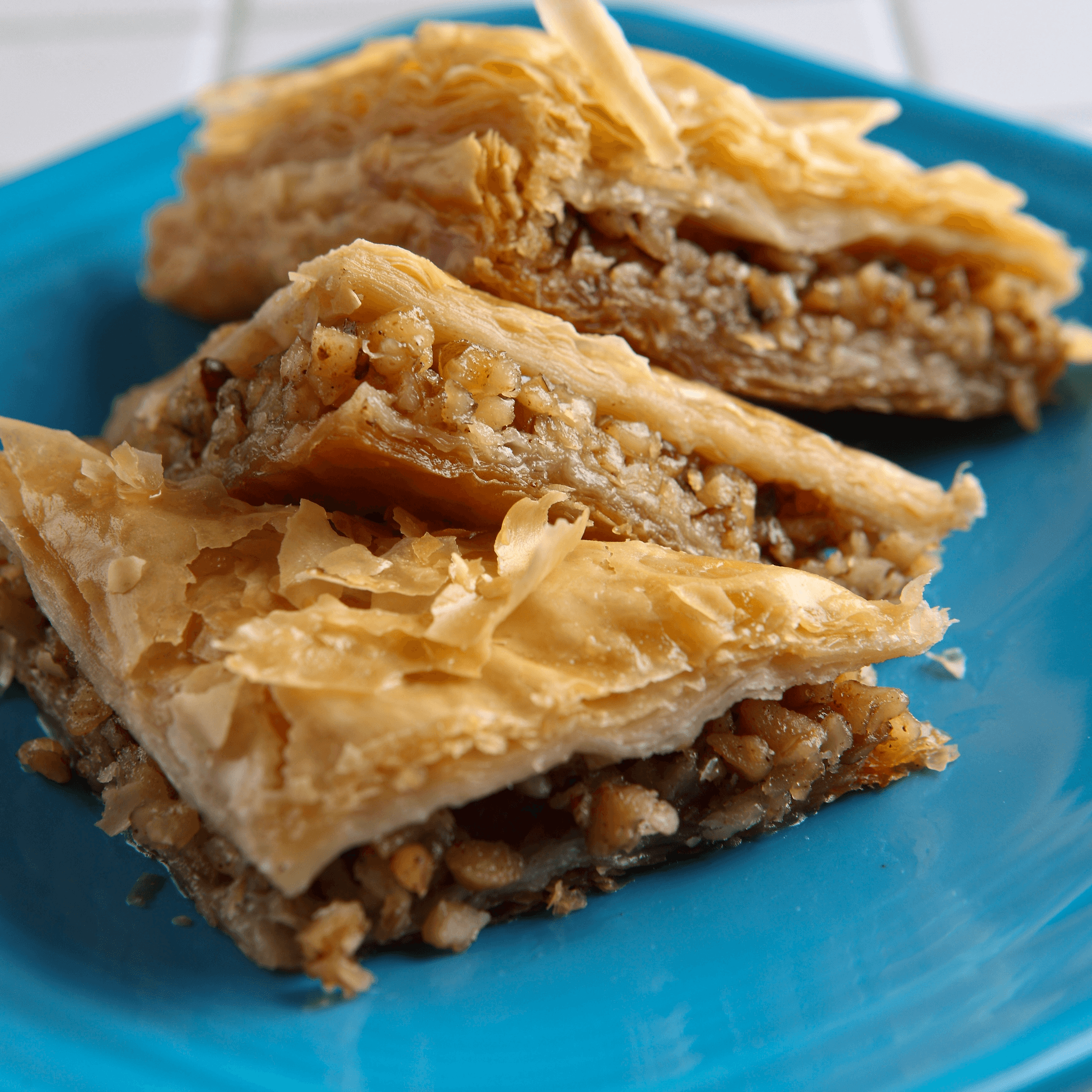 Flaky layers of phyllo pastry with nuts, baked golden and finished with sweet syrup.