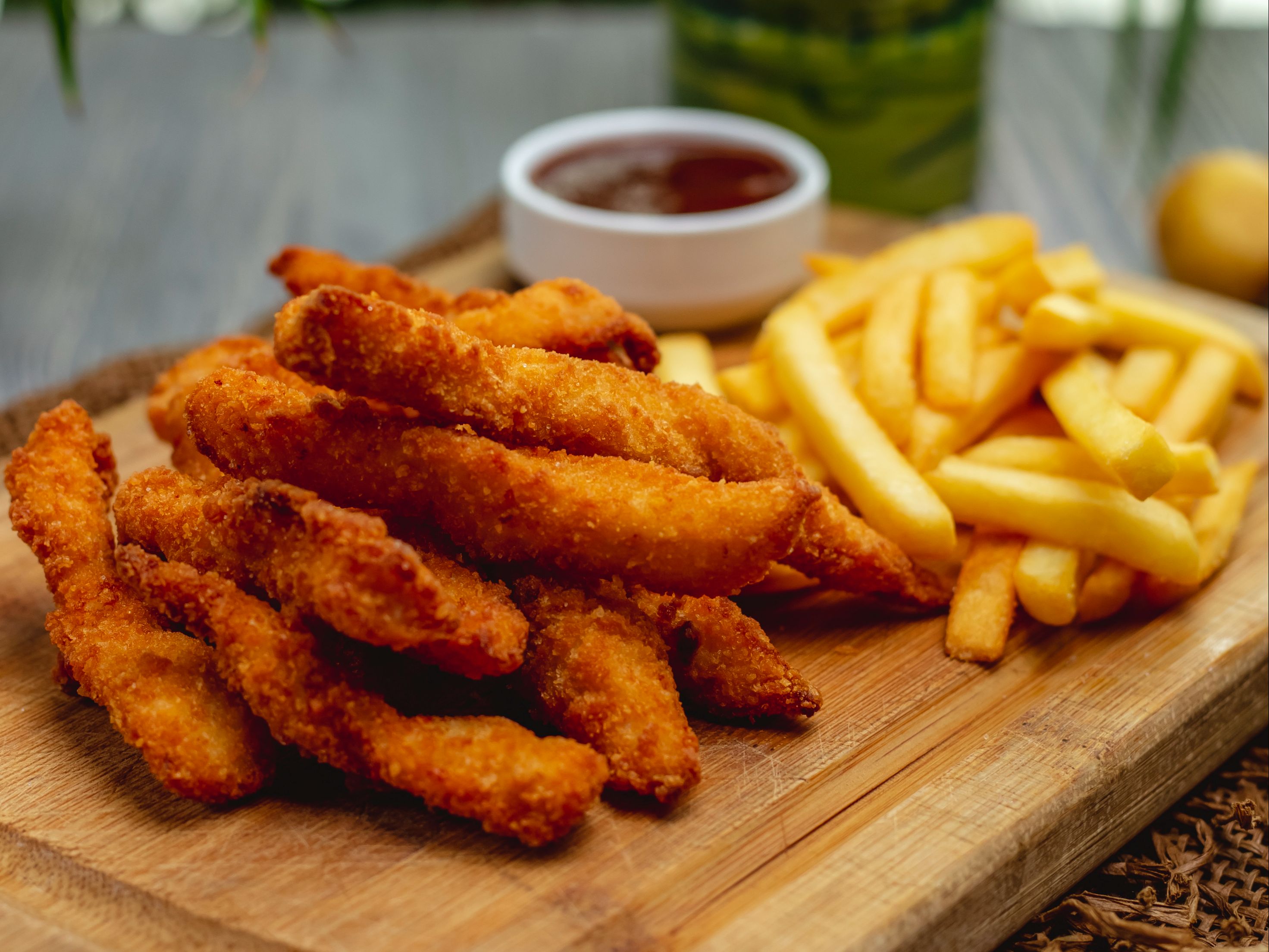 A smaller portion of crispy chicken tenders with fries, made just right for little appetites.