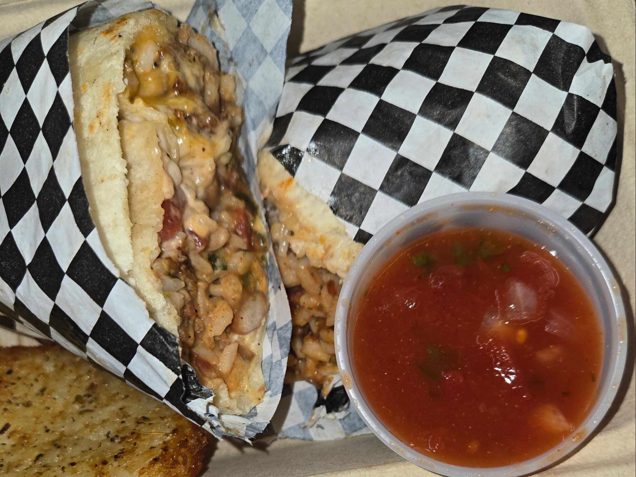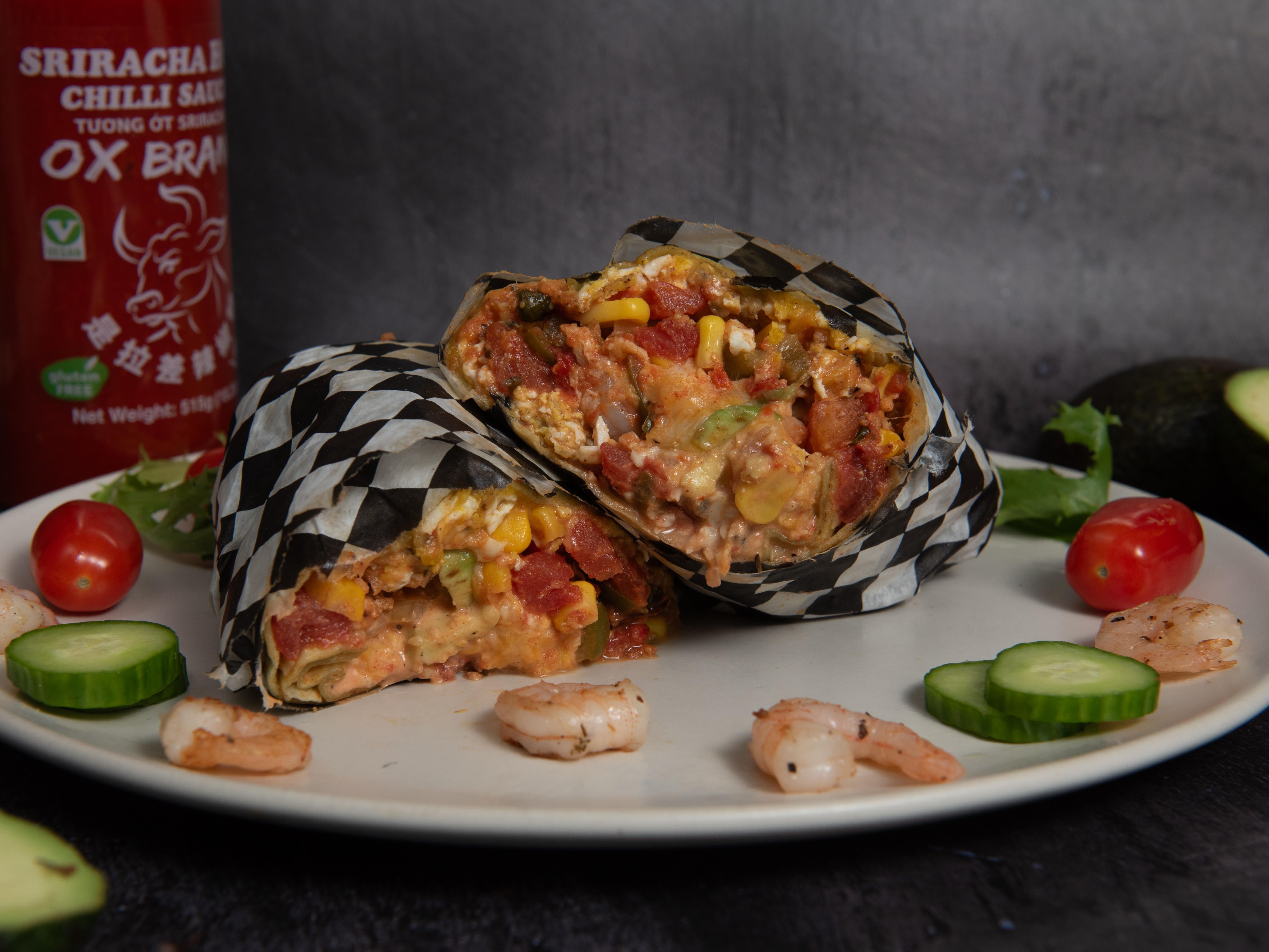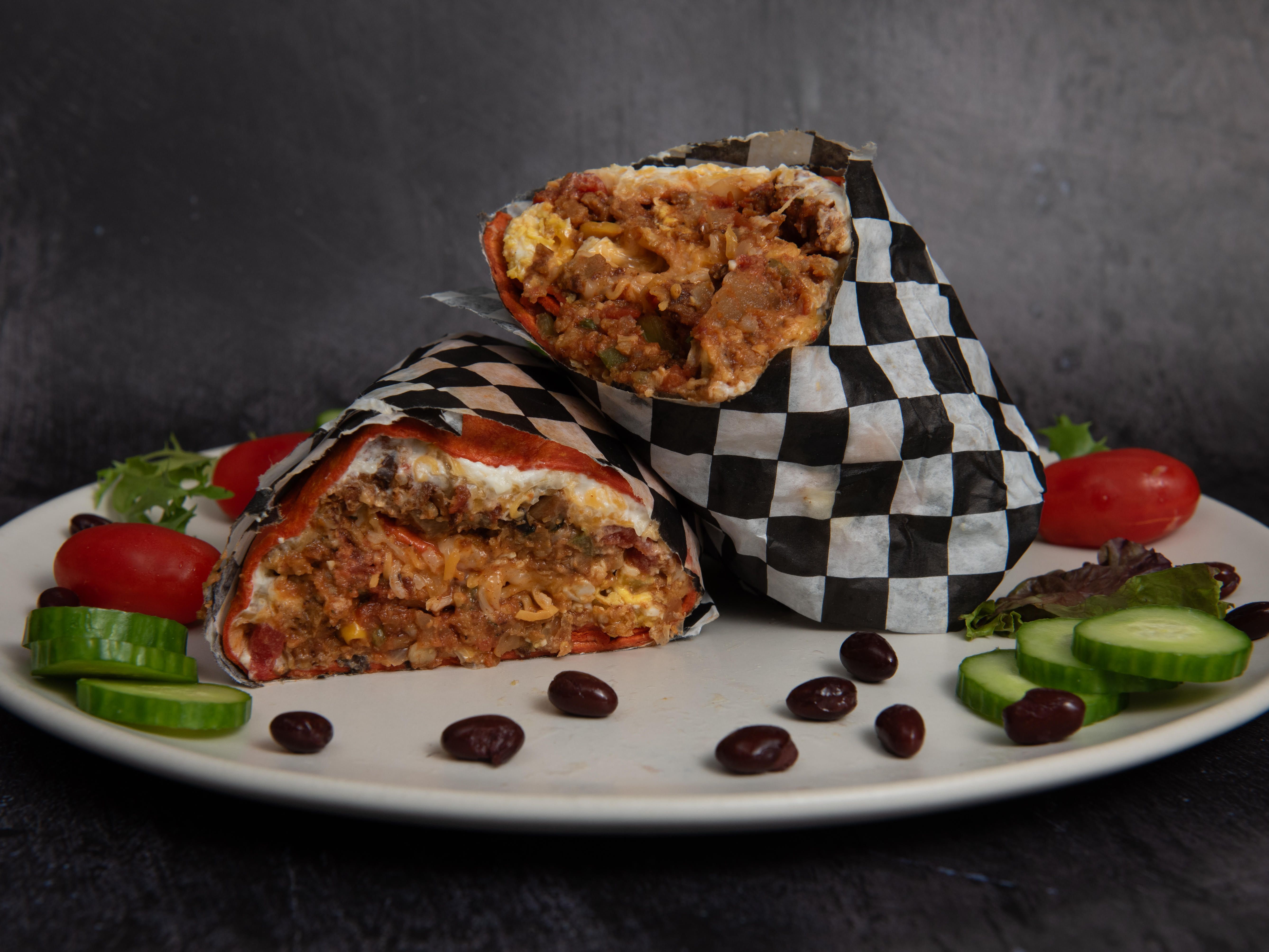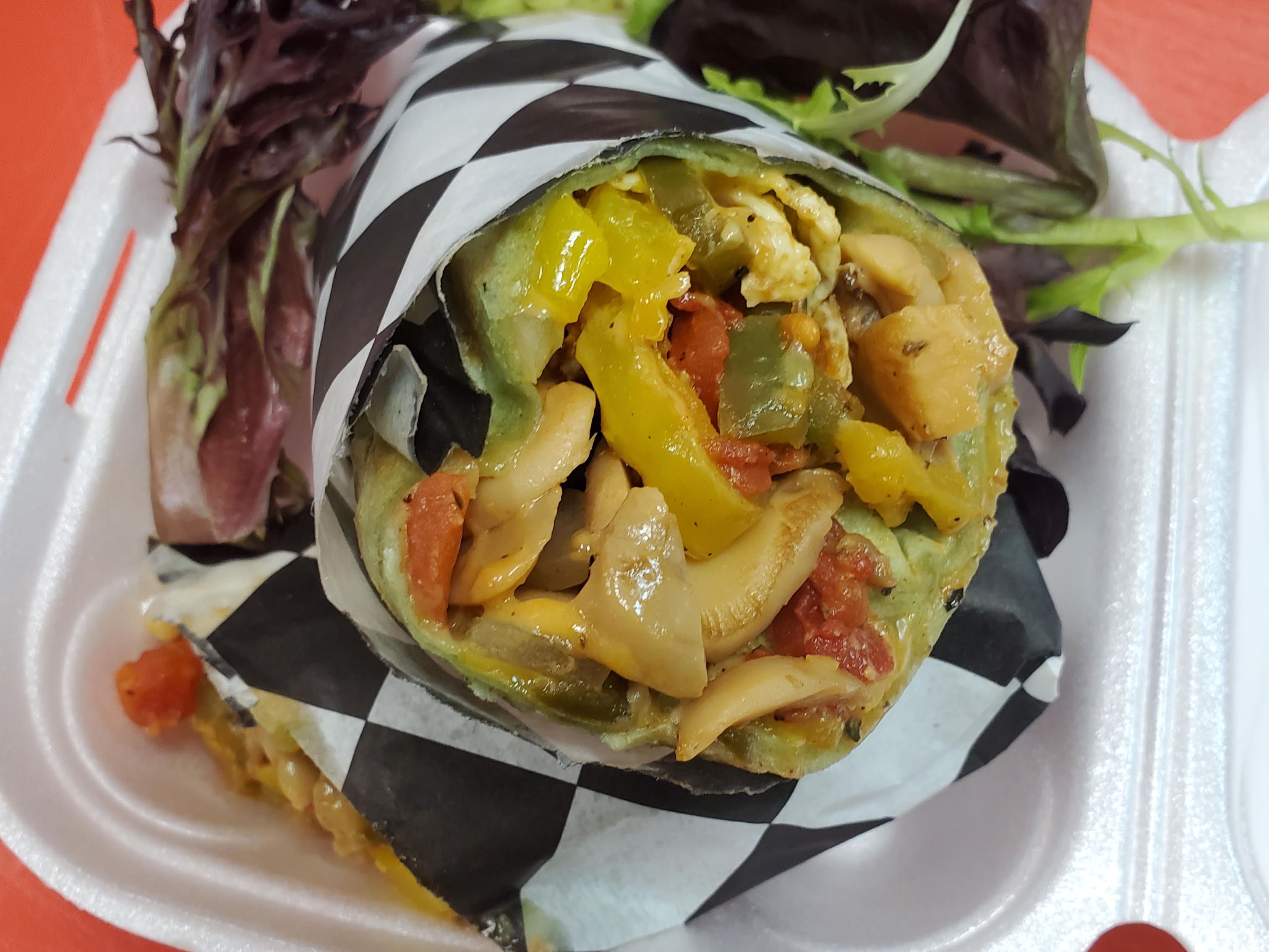 A mix of bell peppers, onions, mushrooms, tomatoes, banana peppers, jalapeños, and scrambled eggs, all wrapped in a flour tortilla and grilled to perfection.