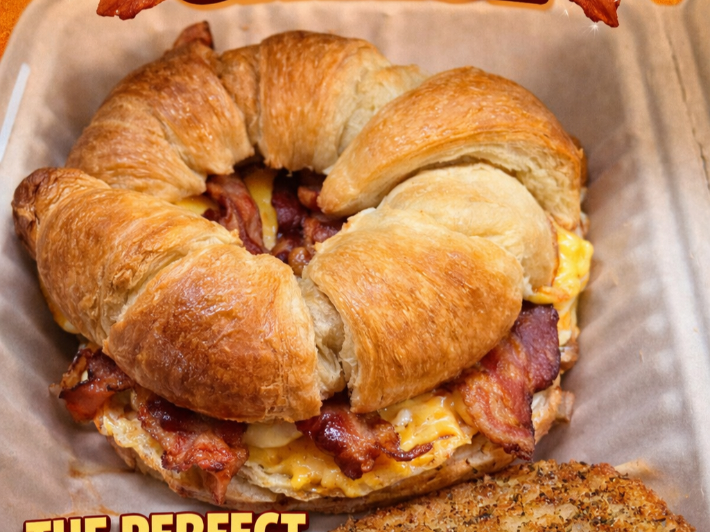 Crispy bacon, fluffy scrambled eggs, and melted cheese tucked inside a golden, buttery croissant. Breakfast done right.