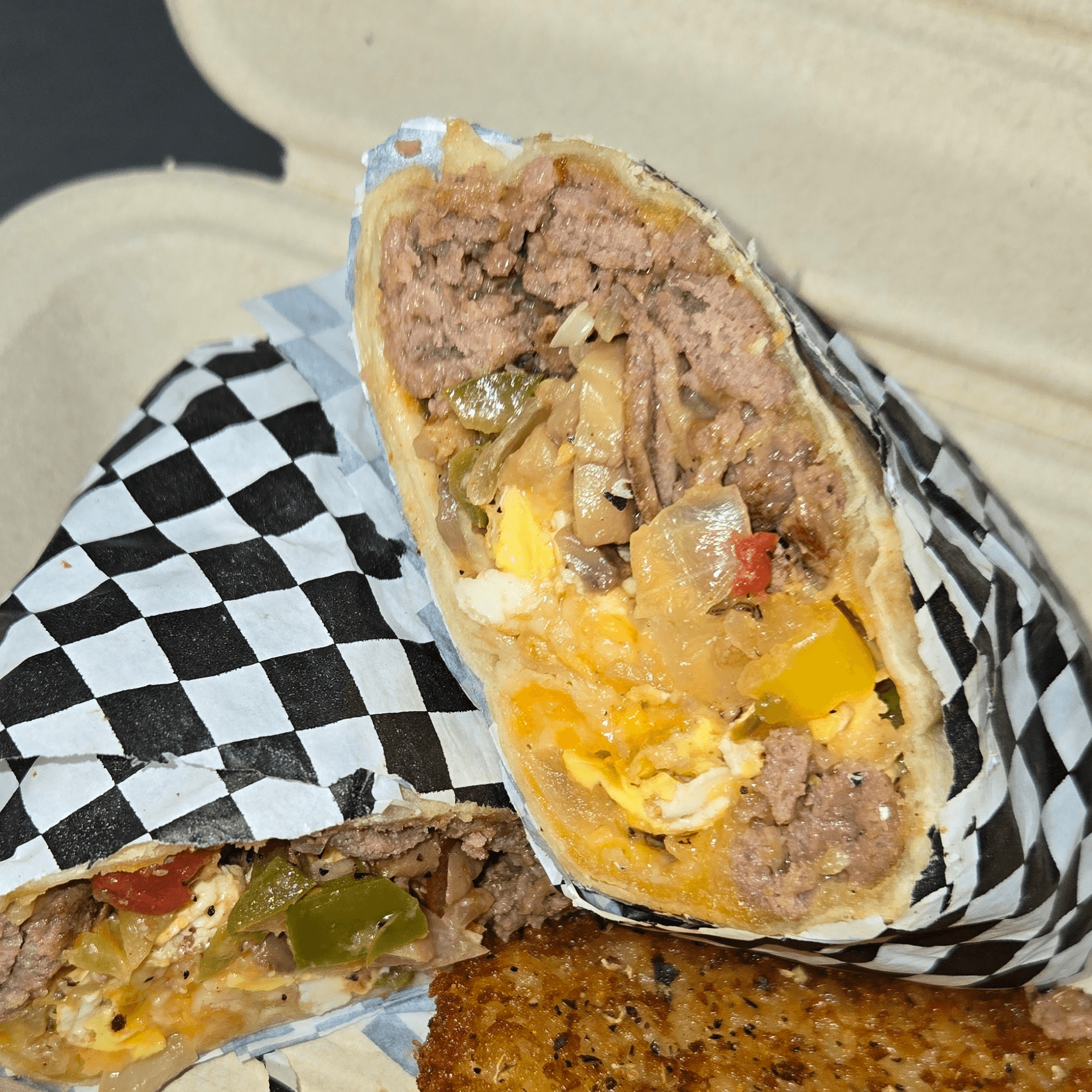 Tender steak, scrambled eggs, and melted cheese wrapped in a warm flour tortilla, grilled to a golden finish.