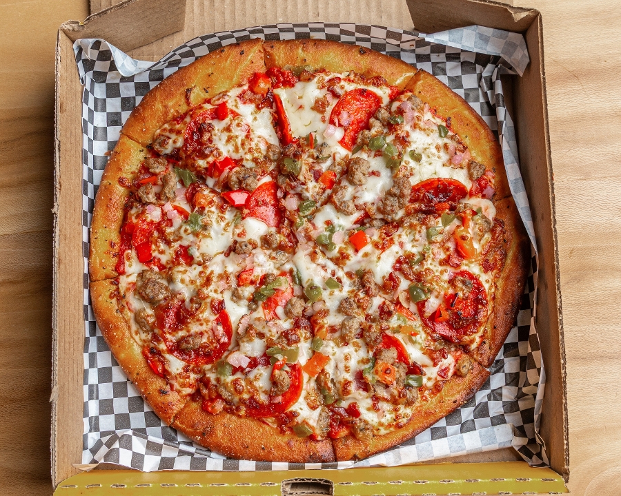 Pizza Sauce, Mozzarella Cheese, Pepperoni, Bell Peppers, Onions, Sausage, Bacon