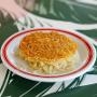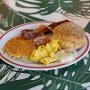 yellow rice, black beans, fried plantain, two eggs, cuban pork