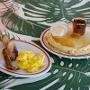 purple sweet potato pancakes, condensed milk, fresh berries, toasted coconut, two eggs, protein