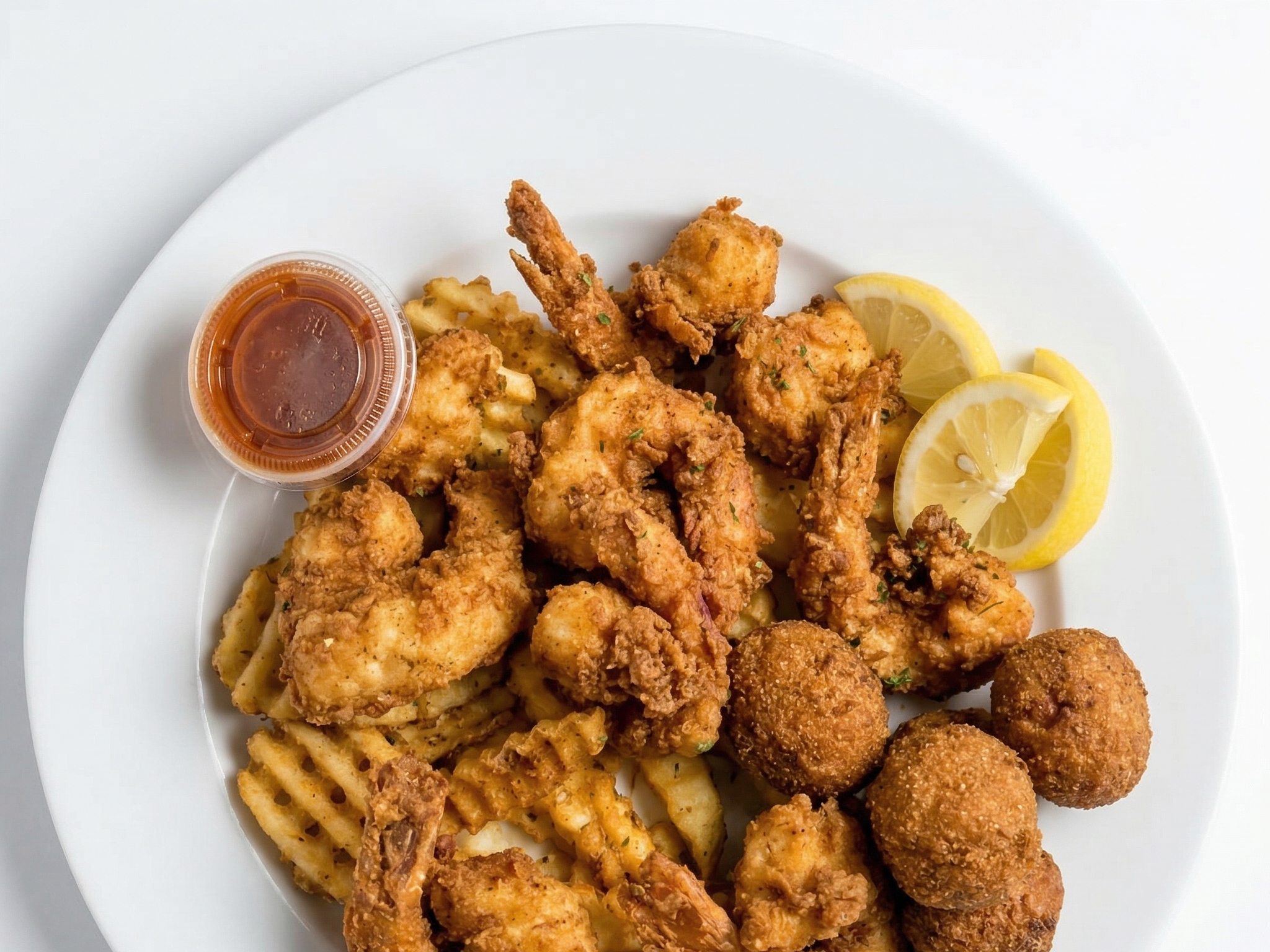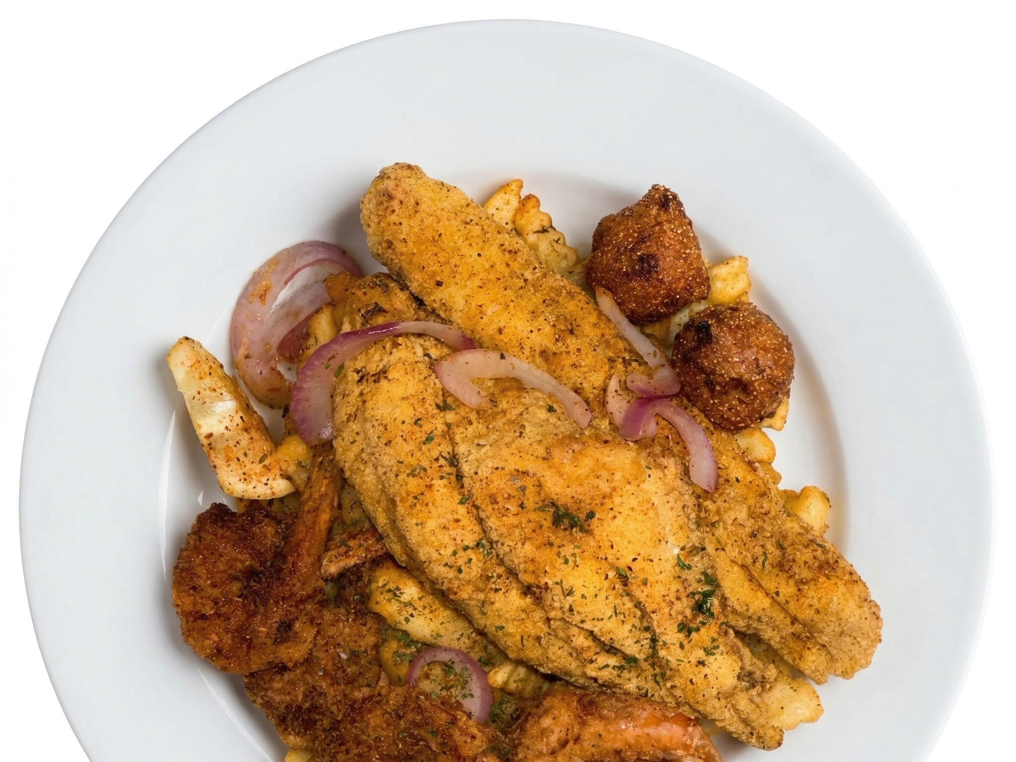 Two catfish fillets and four jumbo shrimp fried to perfection. Served with fries and a choice of one side
