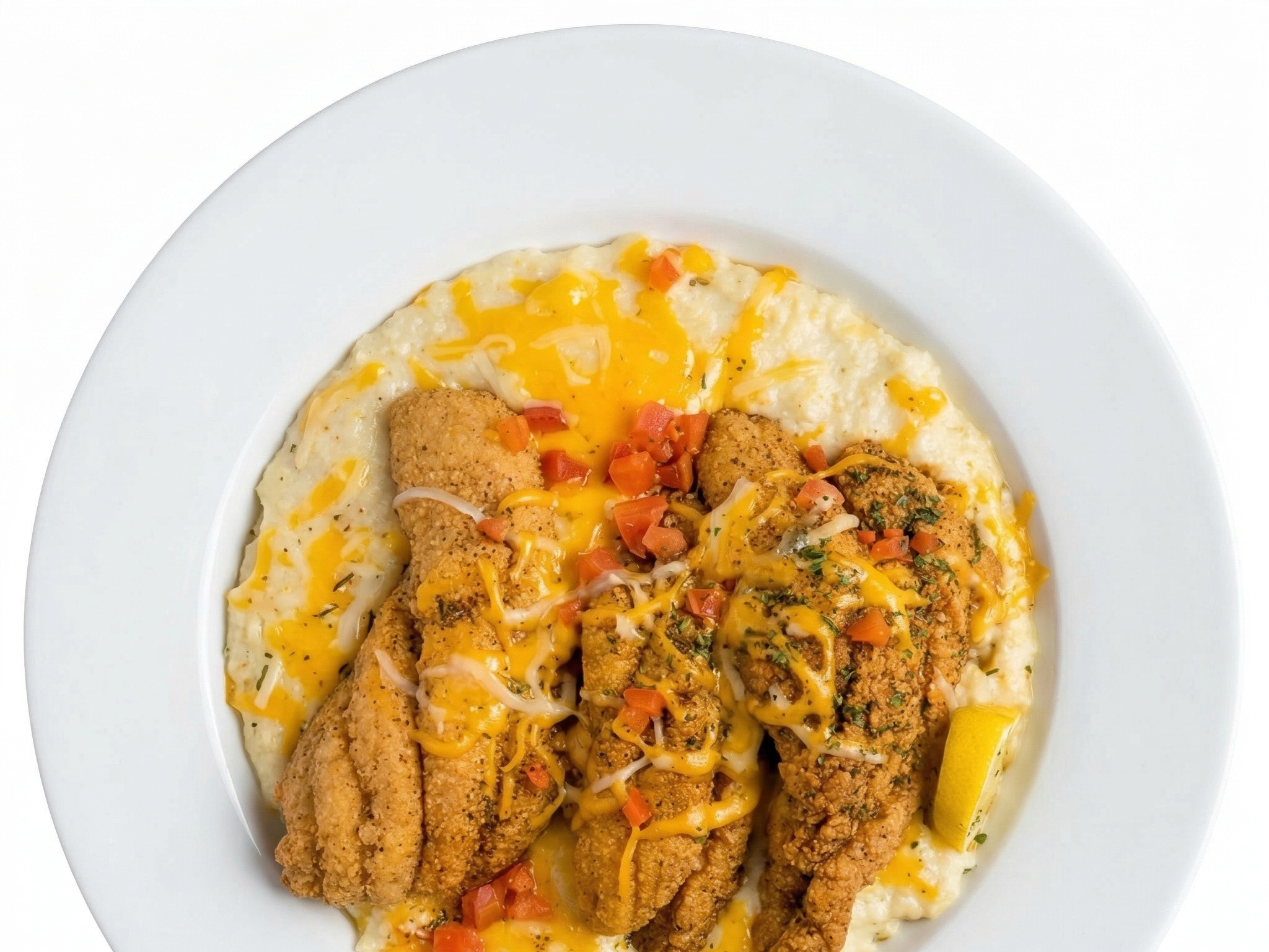 Mississippi farm-raised catfish filets fried or blackened, served on a bed of cheese grits, served with a Cajun cream sauce. Add shrimp for an additional price